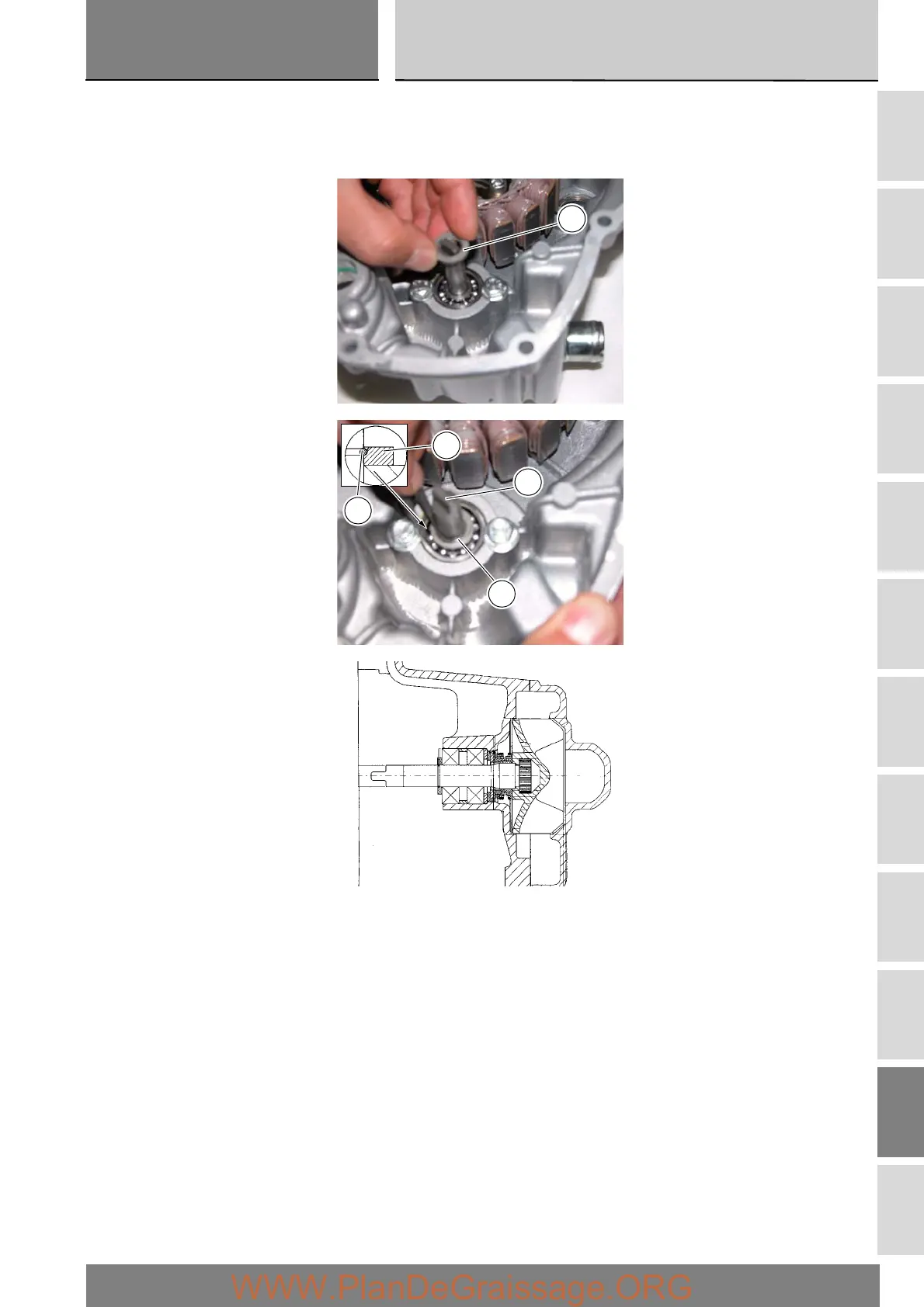 Fit the spacer (4), positioned as shown in the cross-sectional view, and secure with the circlip (3).