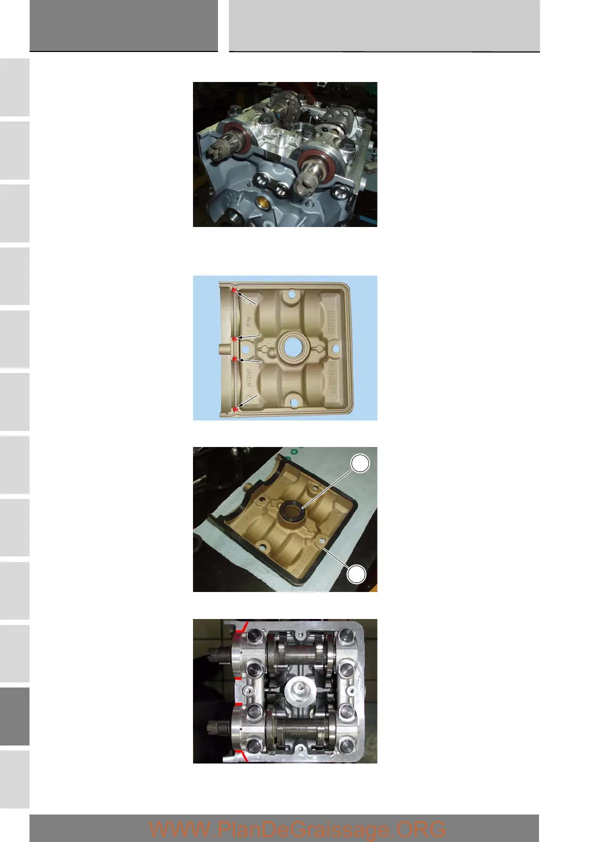 Apply sealant (Three Bond 1215 liquid gasket) at the four points of the rocker cover shown in red in the photo.