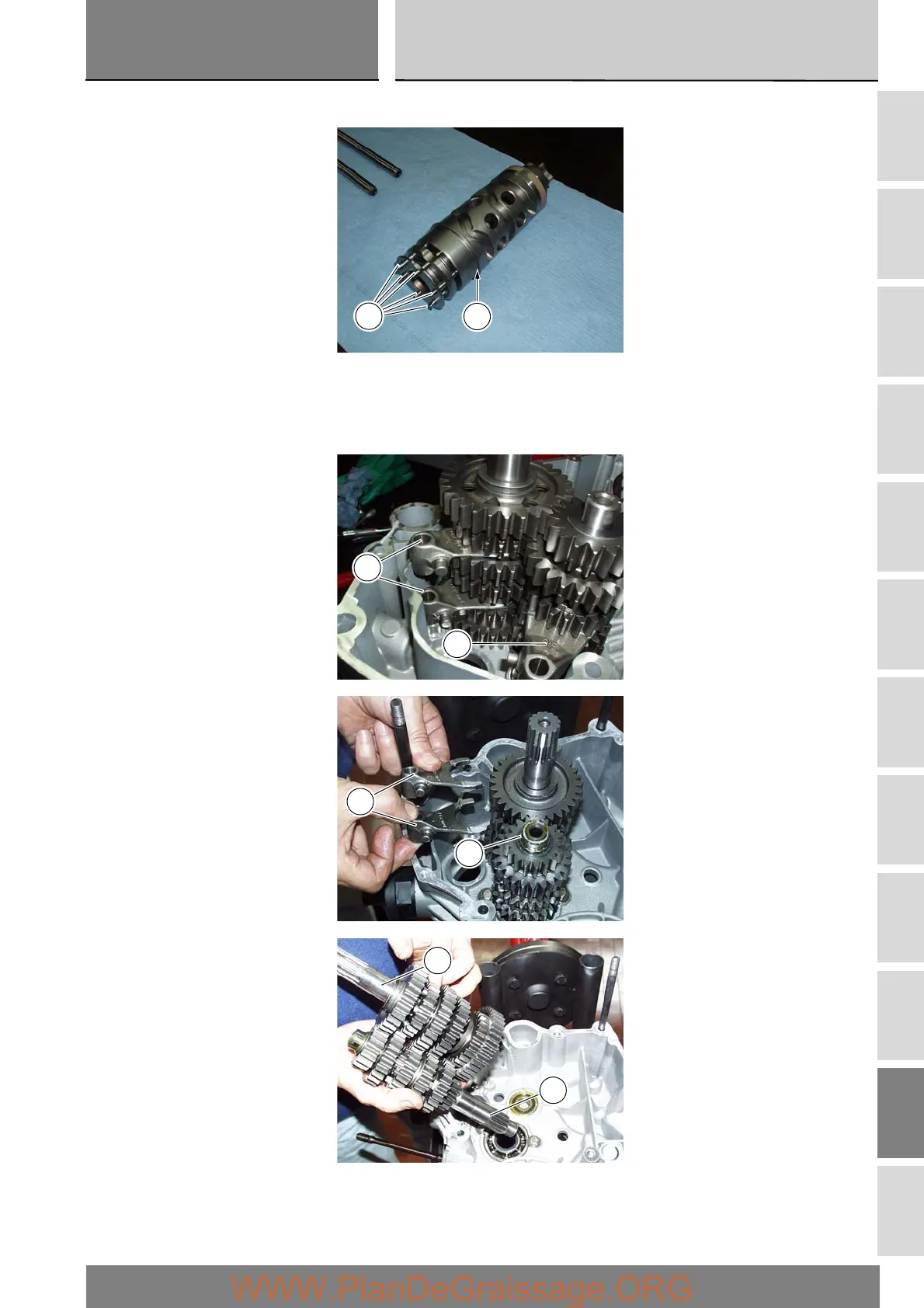 Remove the gearbox input (2) and output (25) shafts complete with gears, taking care to recover the spacers on the ends of the