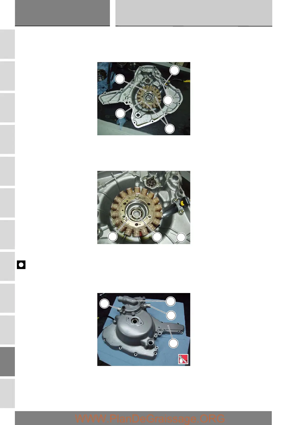 Undo the three stator retaining bolts (25) and the two cable guide bracket (31) retaining bolts (32) from inside the lh crankcase