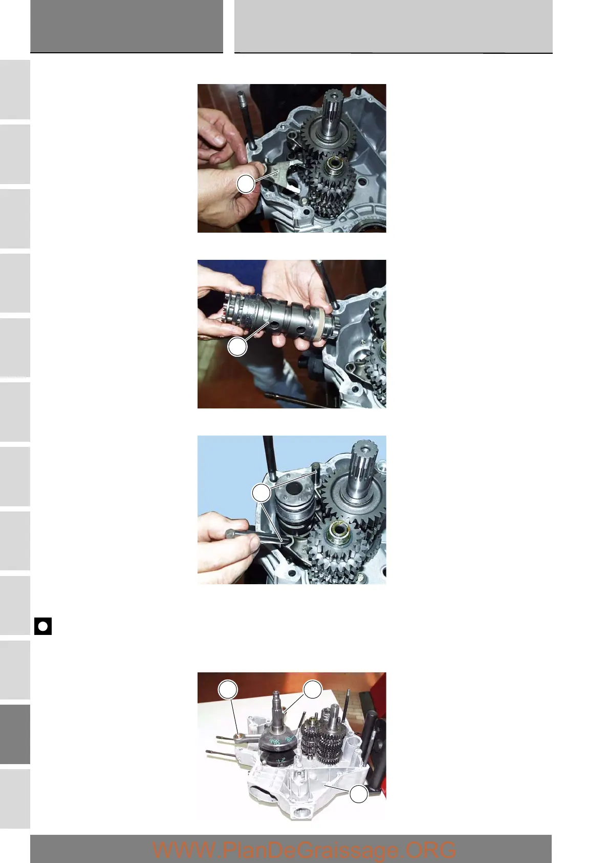 Fit the pins (G) in the previously installed selector forks.