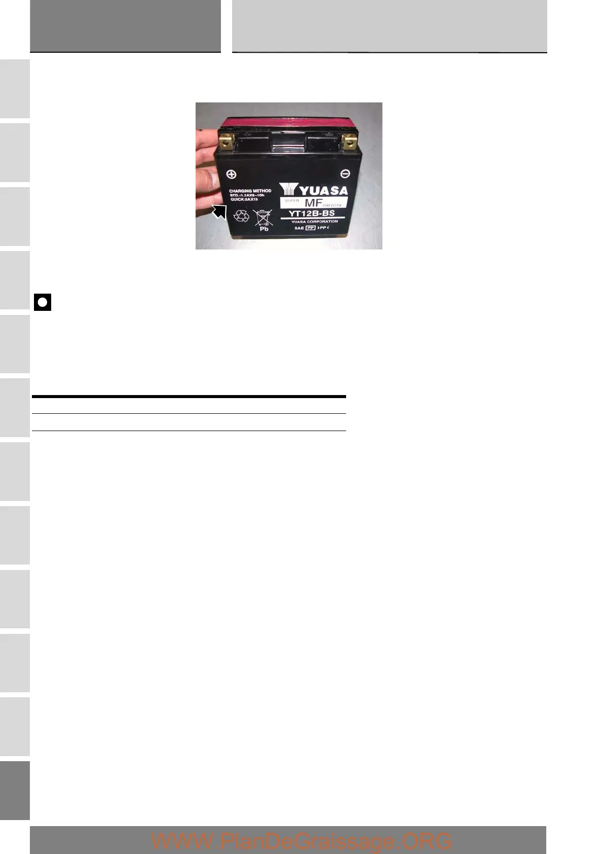 Charge the battery if the open circuit voltage is lower than 12.8 V. Leaving the battery discharged for more than one month could