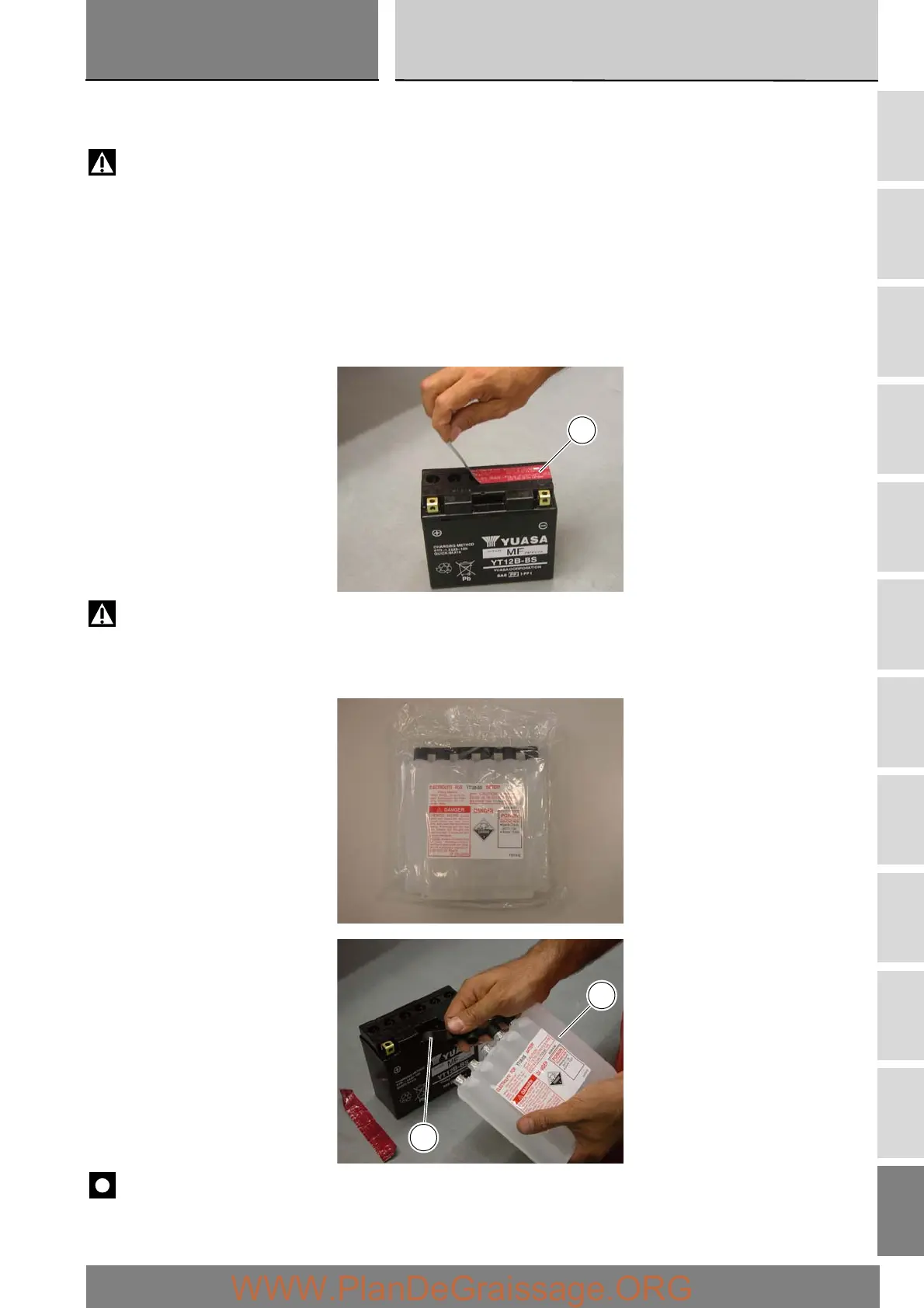 vegetable oil. Do not allow sparks, flames, cigarettes or any other heat source near the battery, as it produces explosive gases.