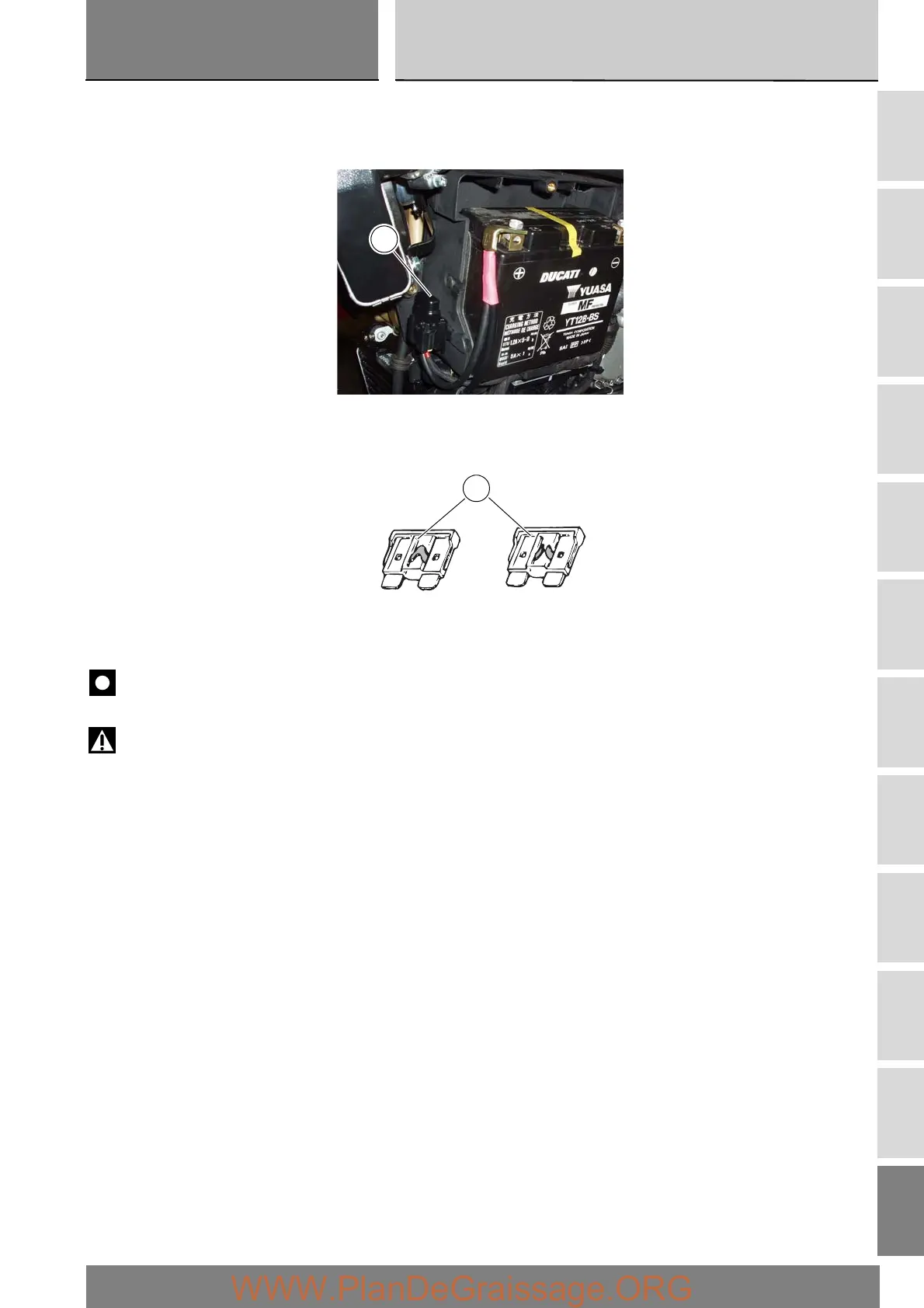 The 30 A, fuse located at the side of the battery protects the electronic regulator. To gain access to the fuse, remove the left-