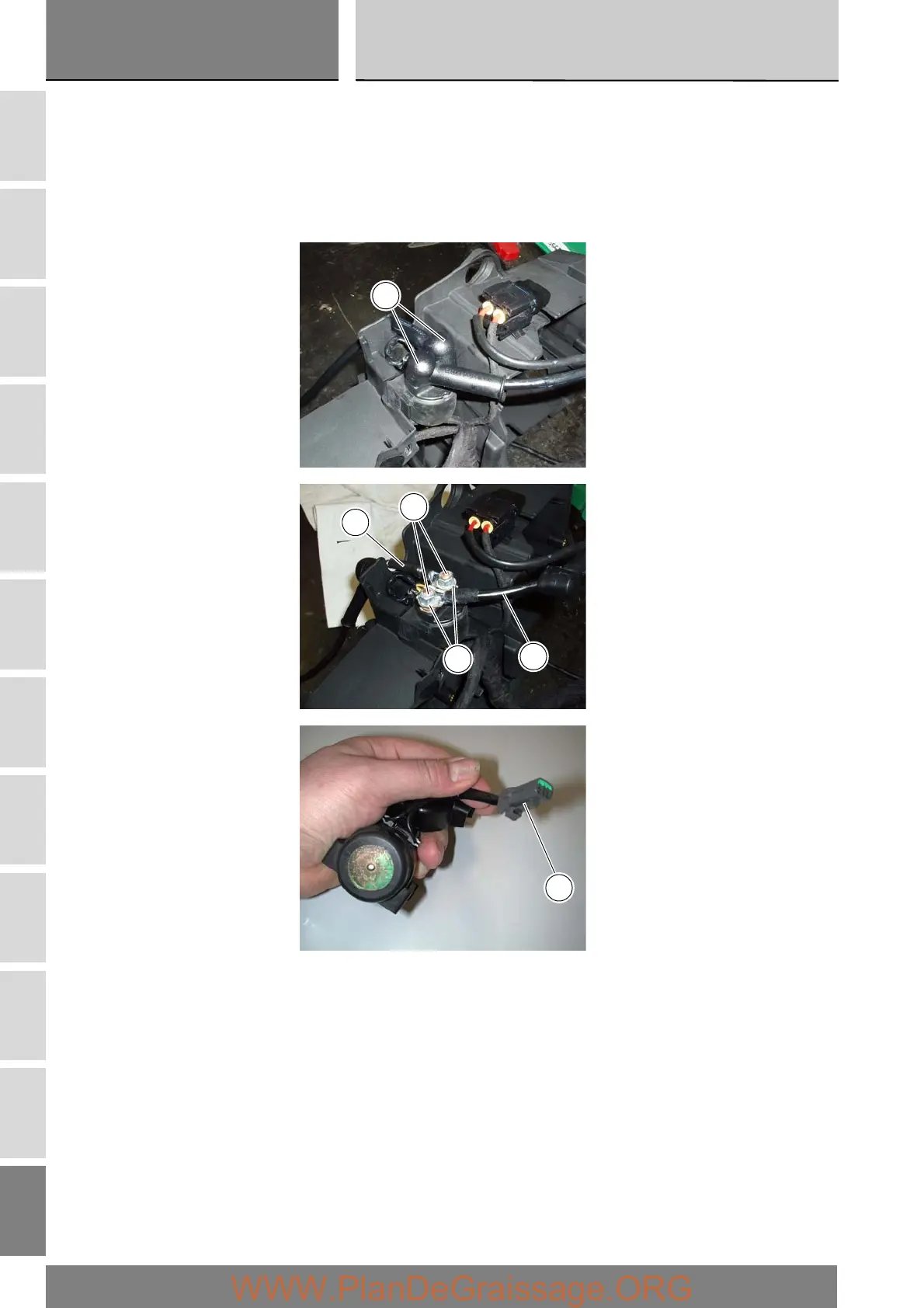 Disconnect starter motor connector (5) from the wiring (see tables in chapter “Routing of wiring on frame”, Sect. P 1).