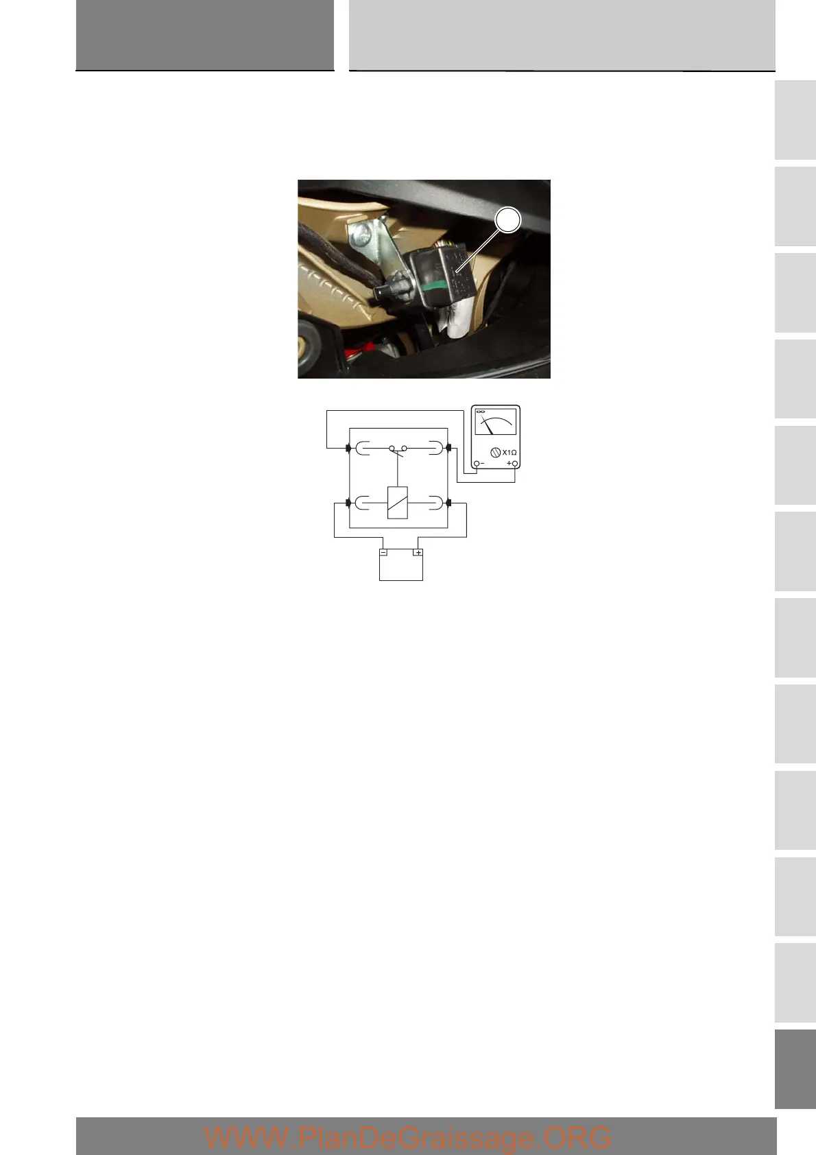 Disconnect the relay (1) from the electrical system and apply 12 V (battery voltage) between contacts (113) and (133) (small