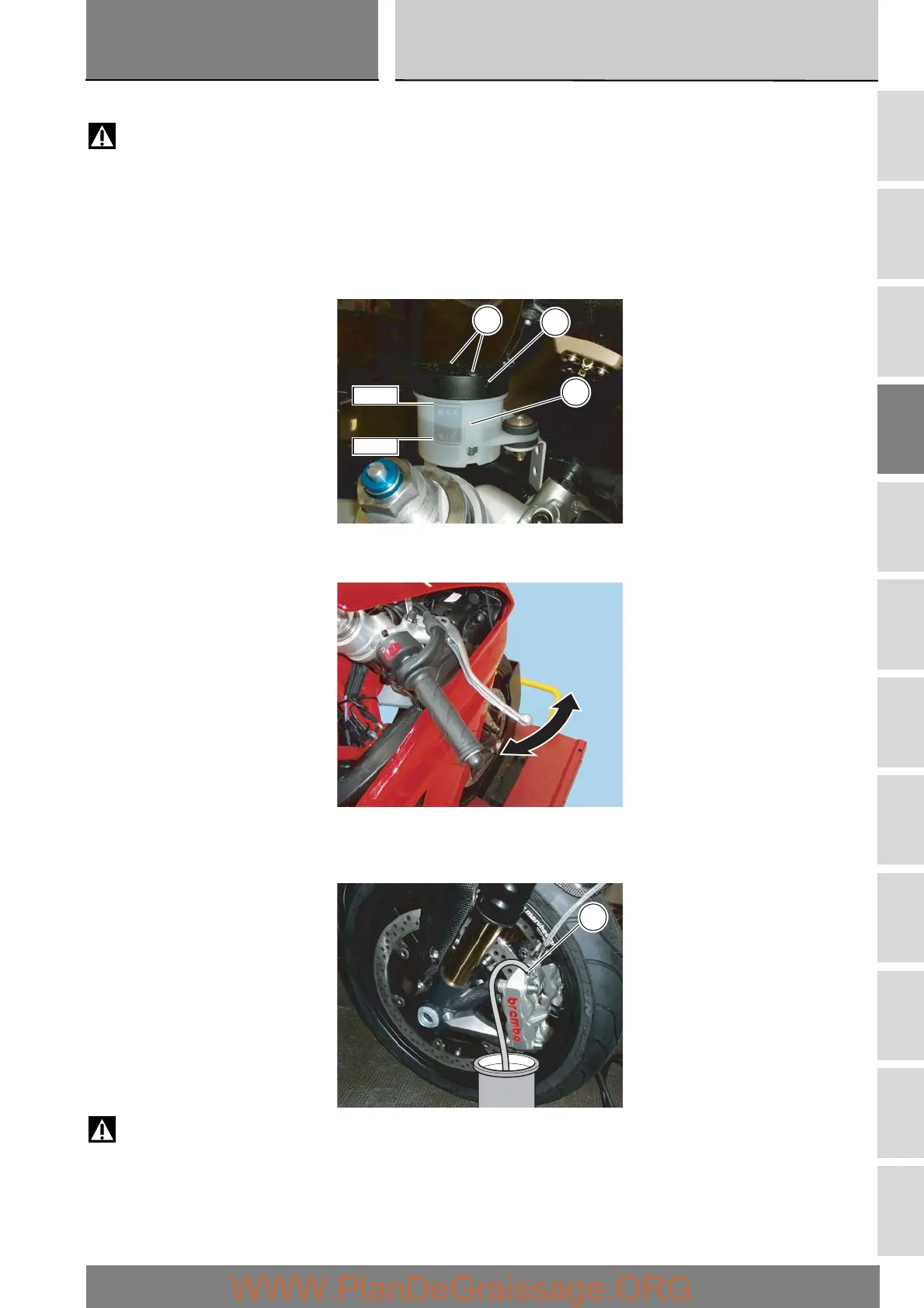 Unscrew the screws (2) and remove the cap (1) and membrane from the front brake fluid reservoir.
