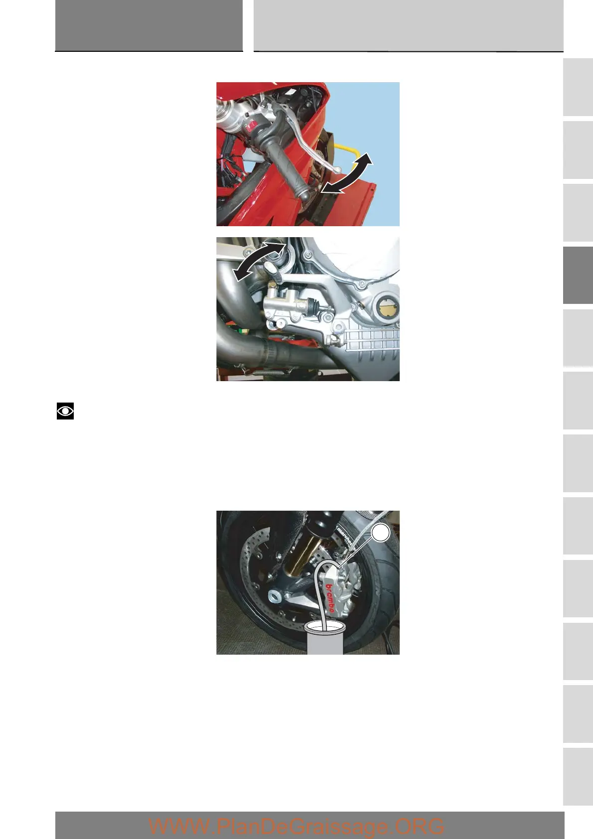 Operate the brake lever (or pedal) several times to allow the fluid to reach all points of the circuit and expel any air.