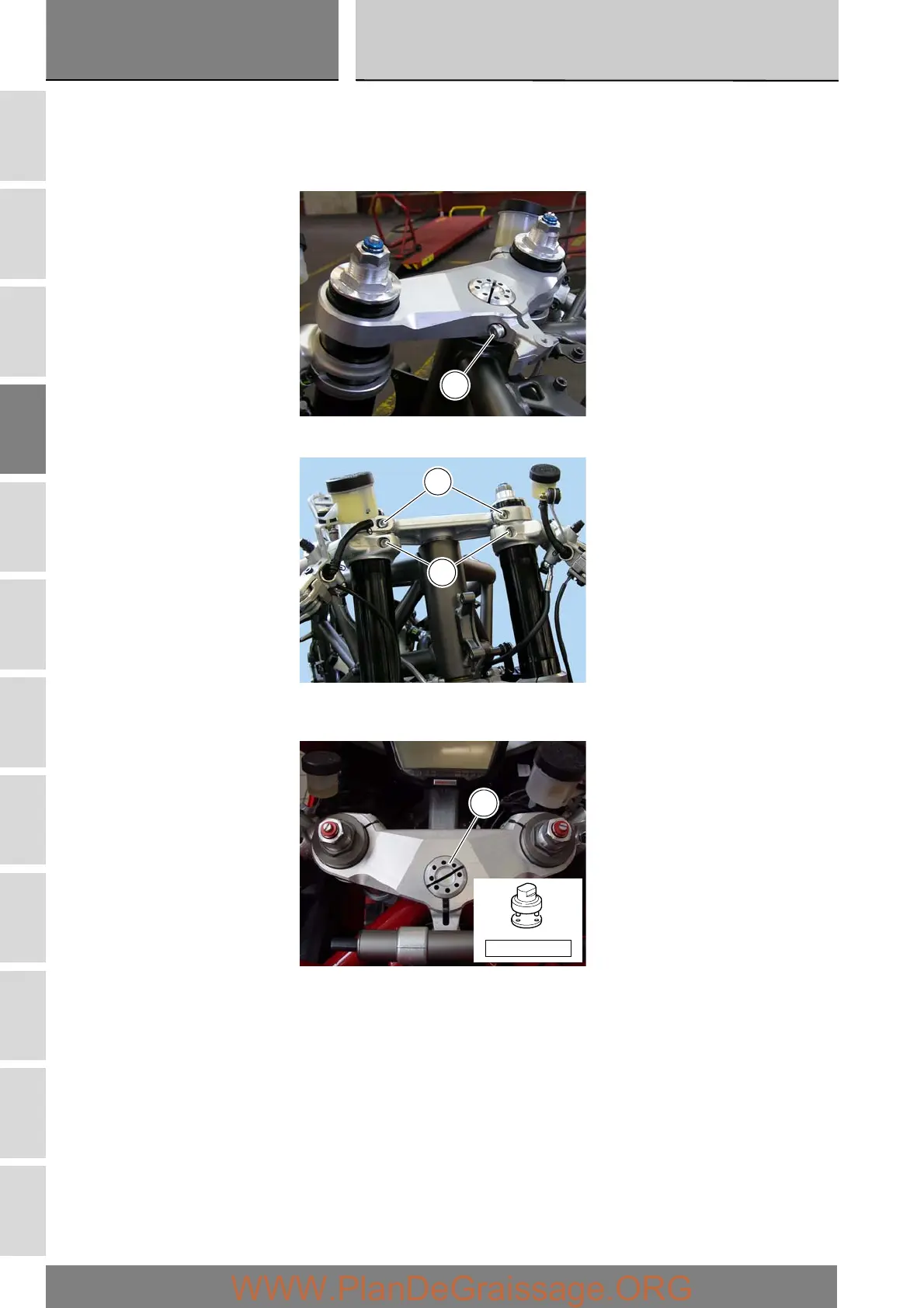 Loosen the clamp bolts (2) securing the top yoke to the fork legs and loosen the handlebar bolts (3).
