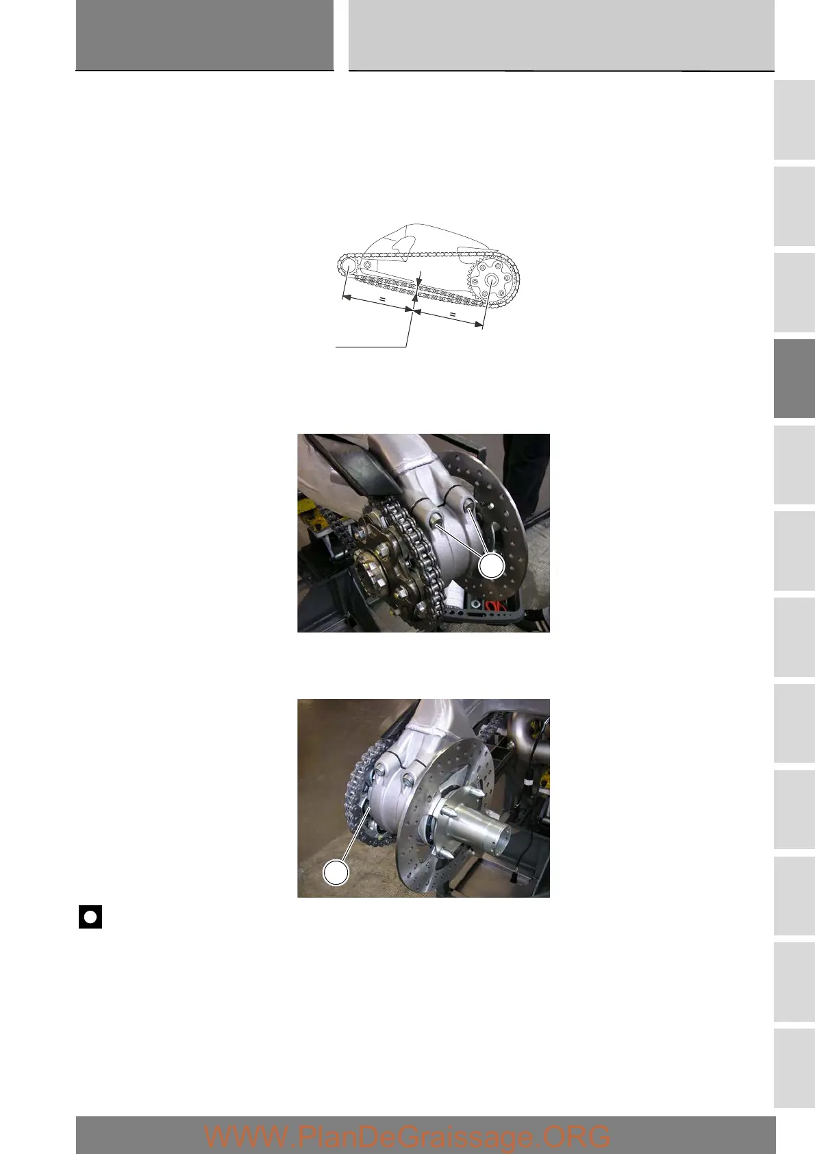 Push the chain upwards with one finger in correspondence with the mid point of the swingarm (see label).