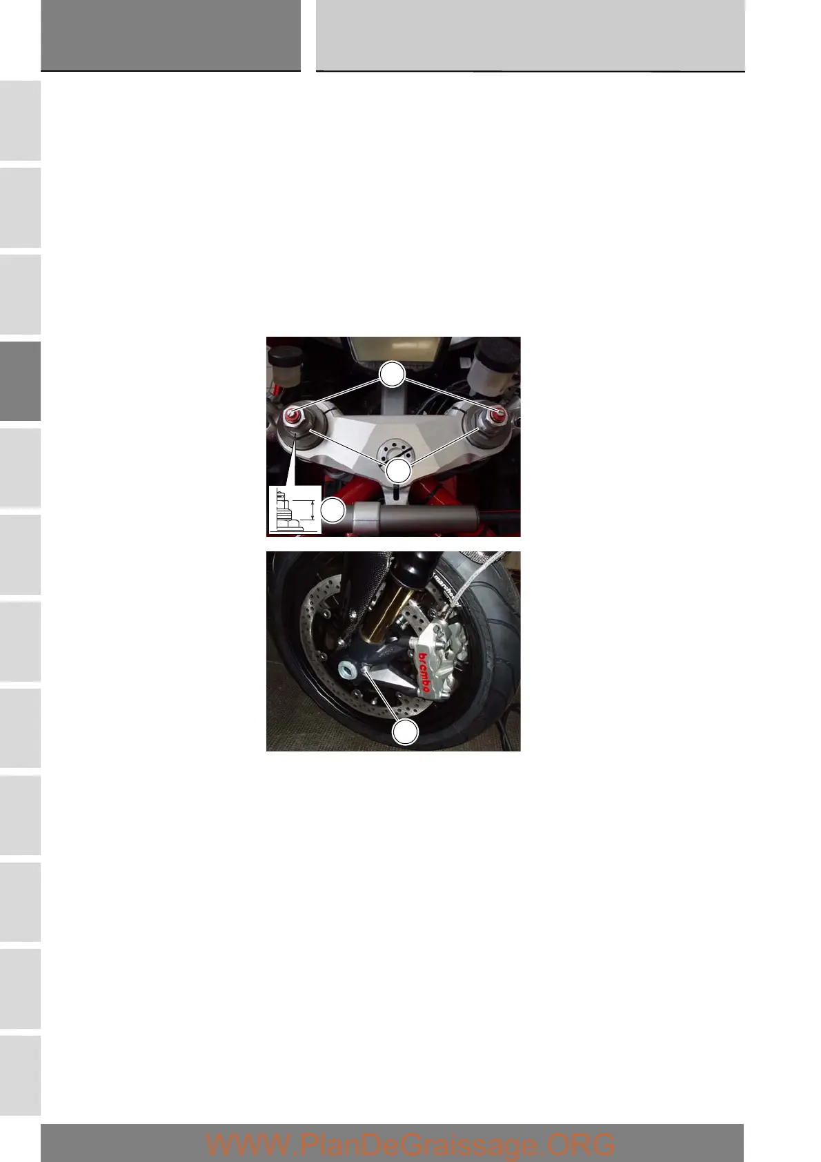 To change the preload on the spring inside each fork leg, turn the hexagonal adjusting nut (2) with a 22-mm hexagon wrench.