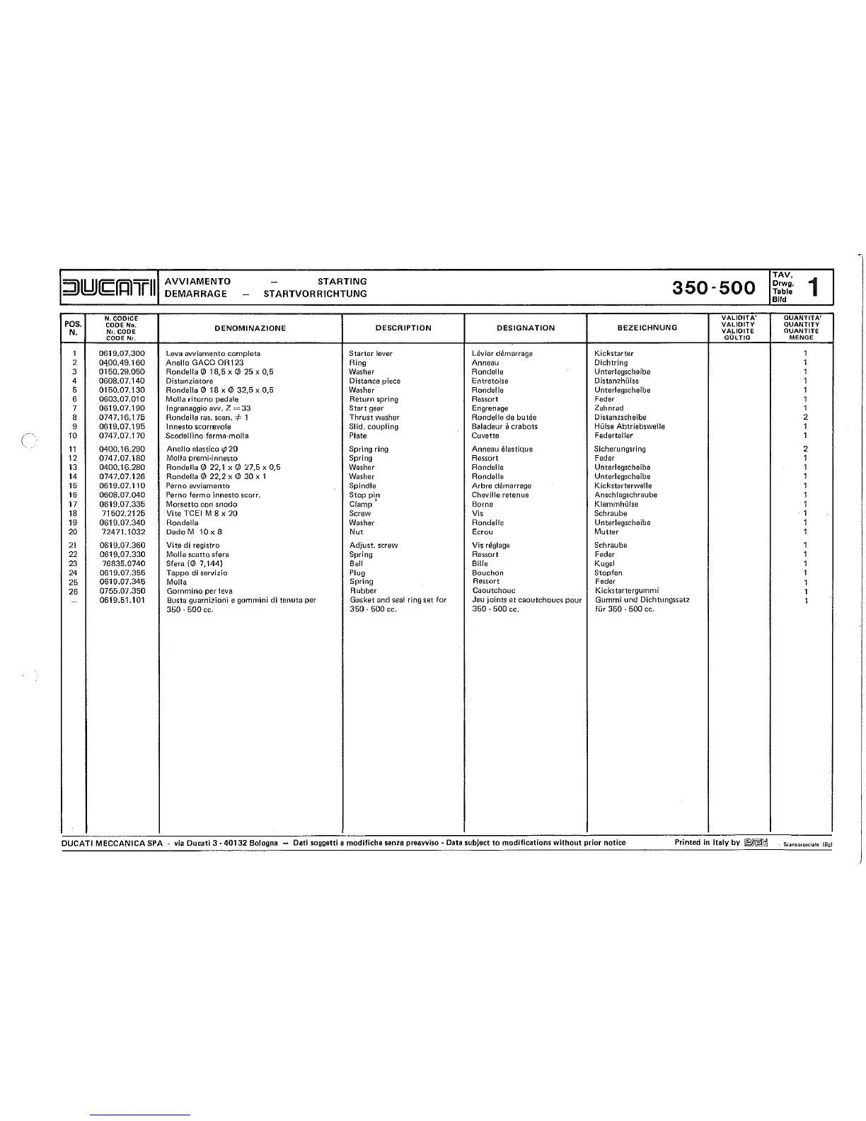 Ducati 350-500 - Starting System; Kickstarter Lever and Return Spring; Starting Gears and Pins