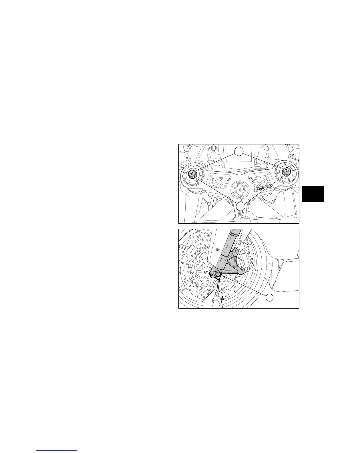 Turn the adjuster (1) on fork leg top with a 3-mm Allen