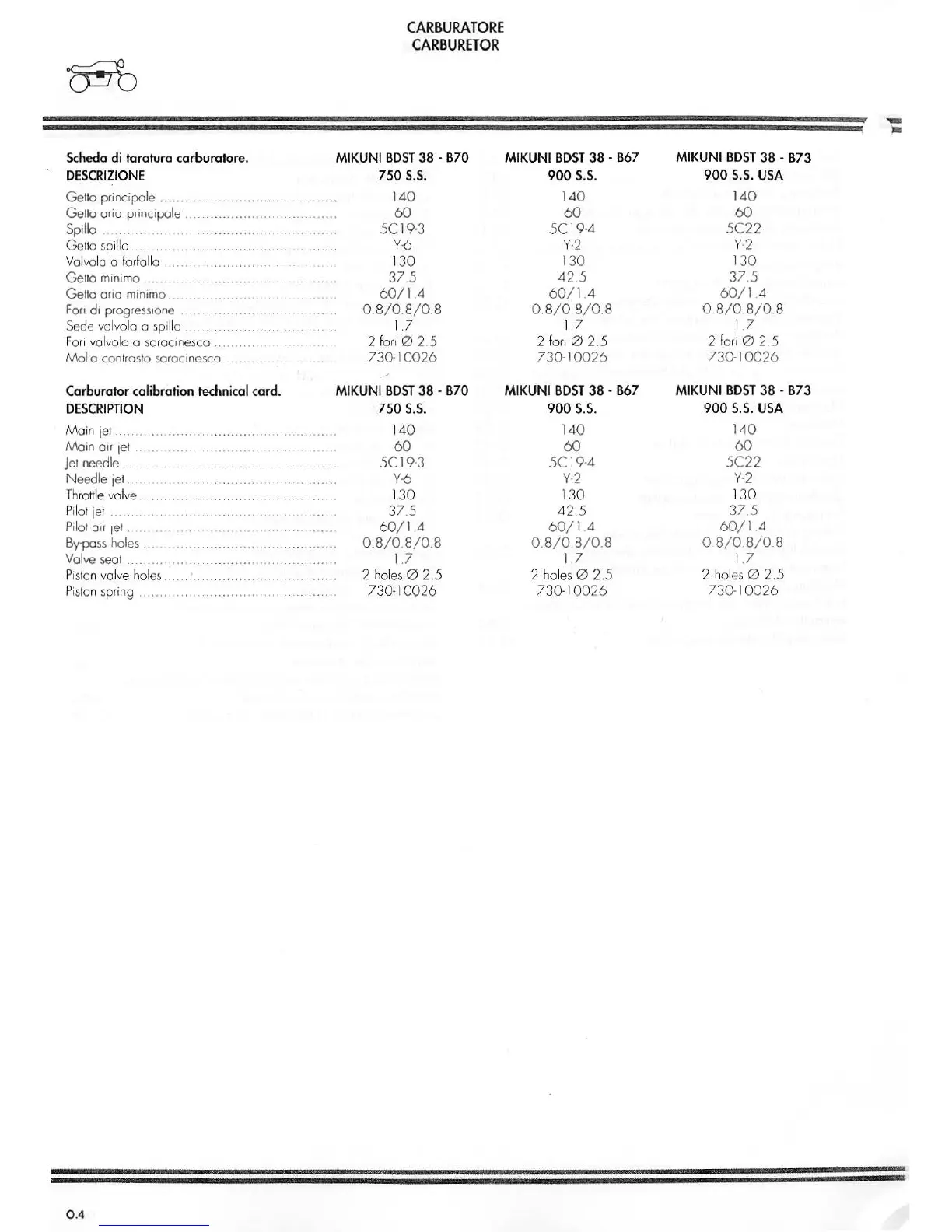 Scheda di taratura carburatore.