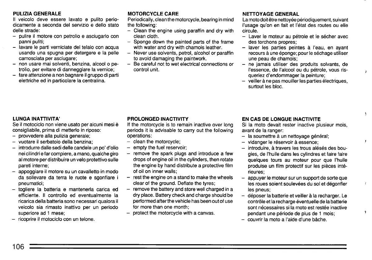 Se il motociclo non viene usato per alcuni mesi è If the motorcycle is to remain inactive over long Si la moto devait rester inactive plusieur maïs,