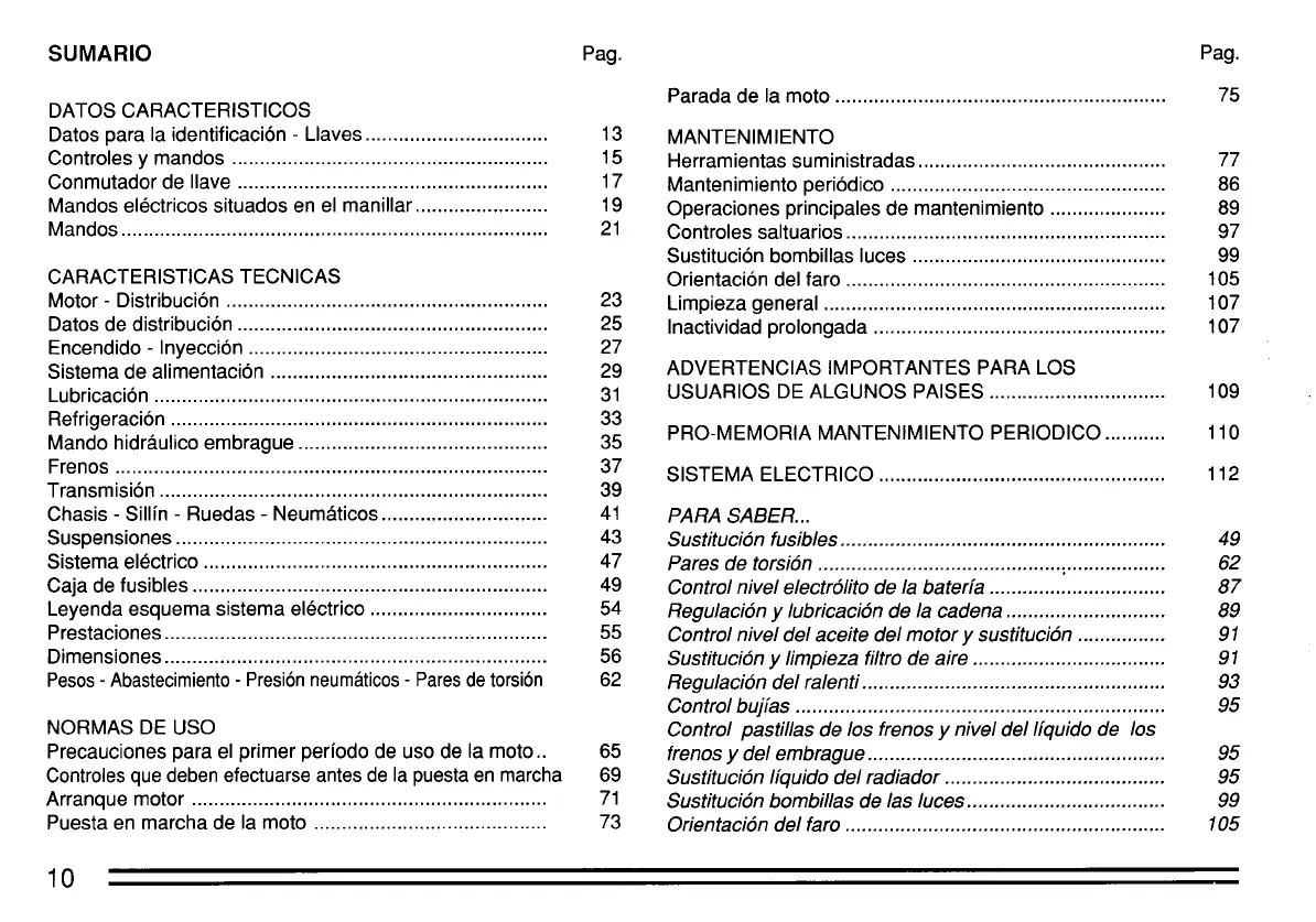 Precauciones para el primer periodo de uso de la moto.. 65 trenos y del embrague 95