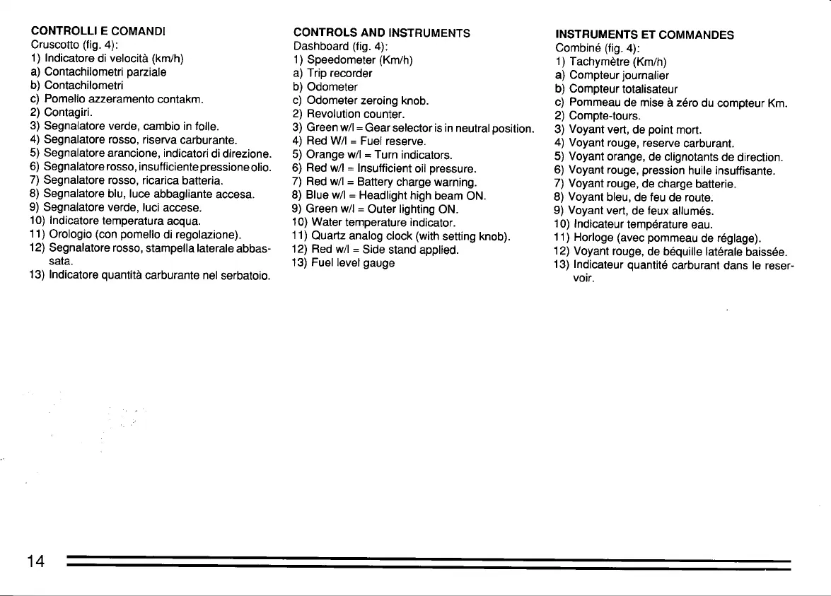 4) Segnalatore rosso, riserva carburante. 4) Red Wil = Fuel reserve. 4) Voyant rouge, reserve carburant.