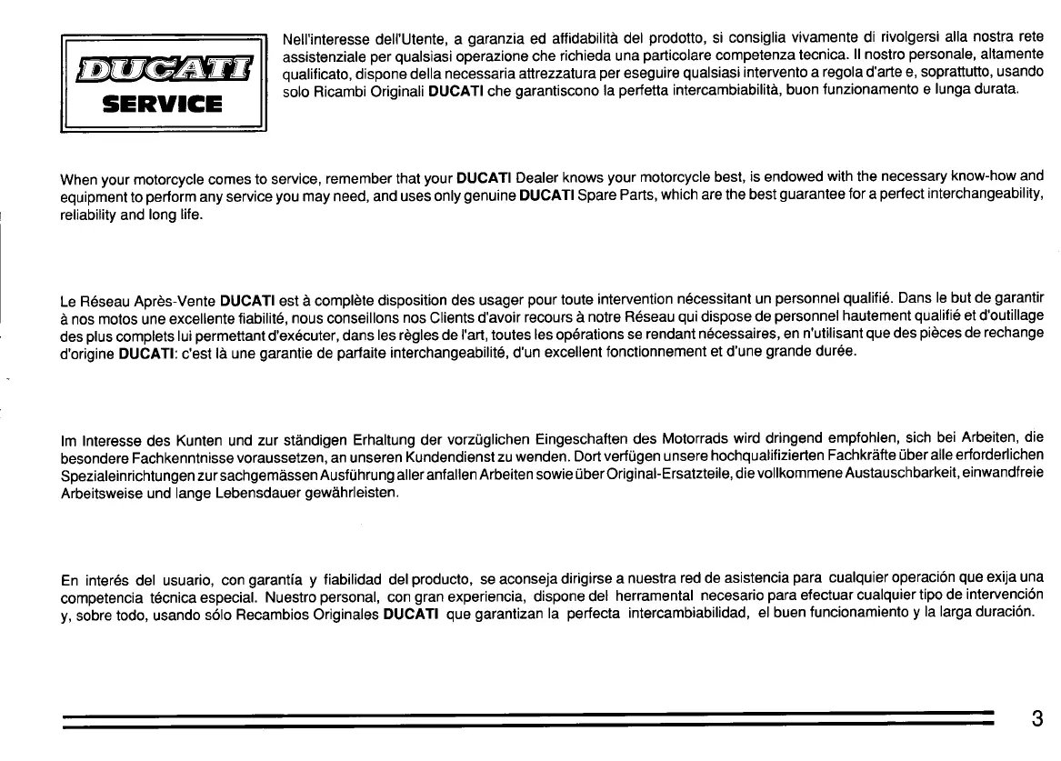 equipment to perform any service you may need, and uses only genuine DUCATI Spare Parts, which are the best guarantee lor a perfect interchangeability,