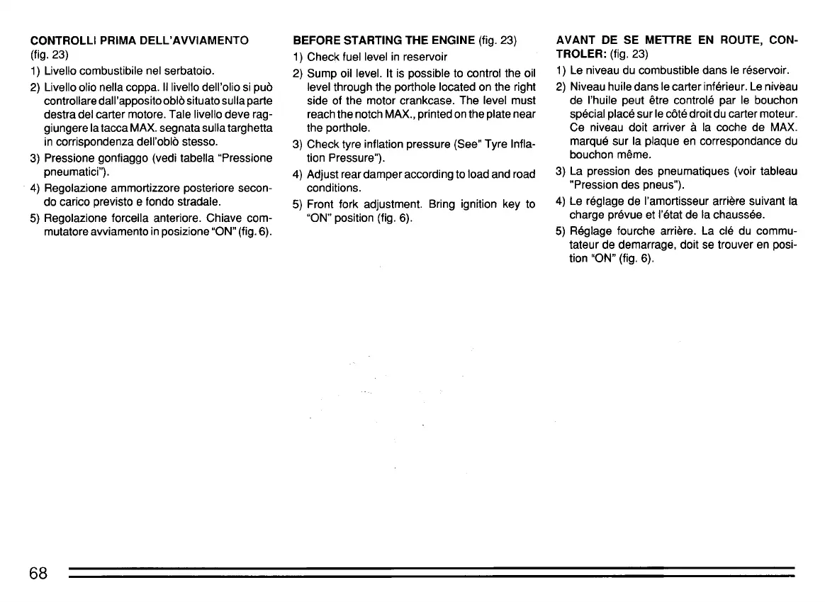 CONTROLLI PRIMA DELL'AVVIAMENTO BEFORE STARTING THE ENGINE (fig. 23) AVANT DE SE METTRE EN ROUTE, CON-