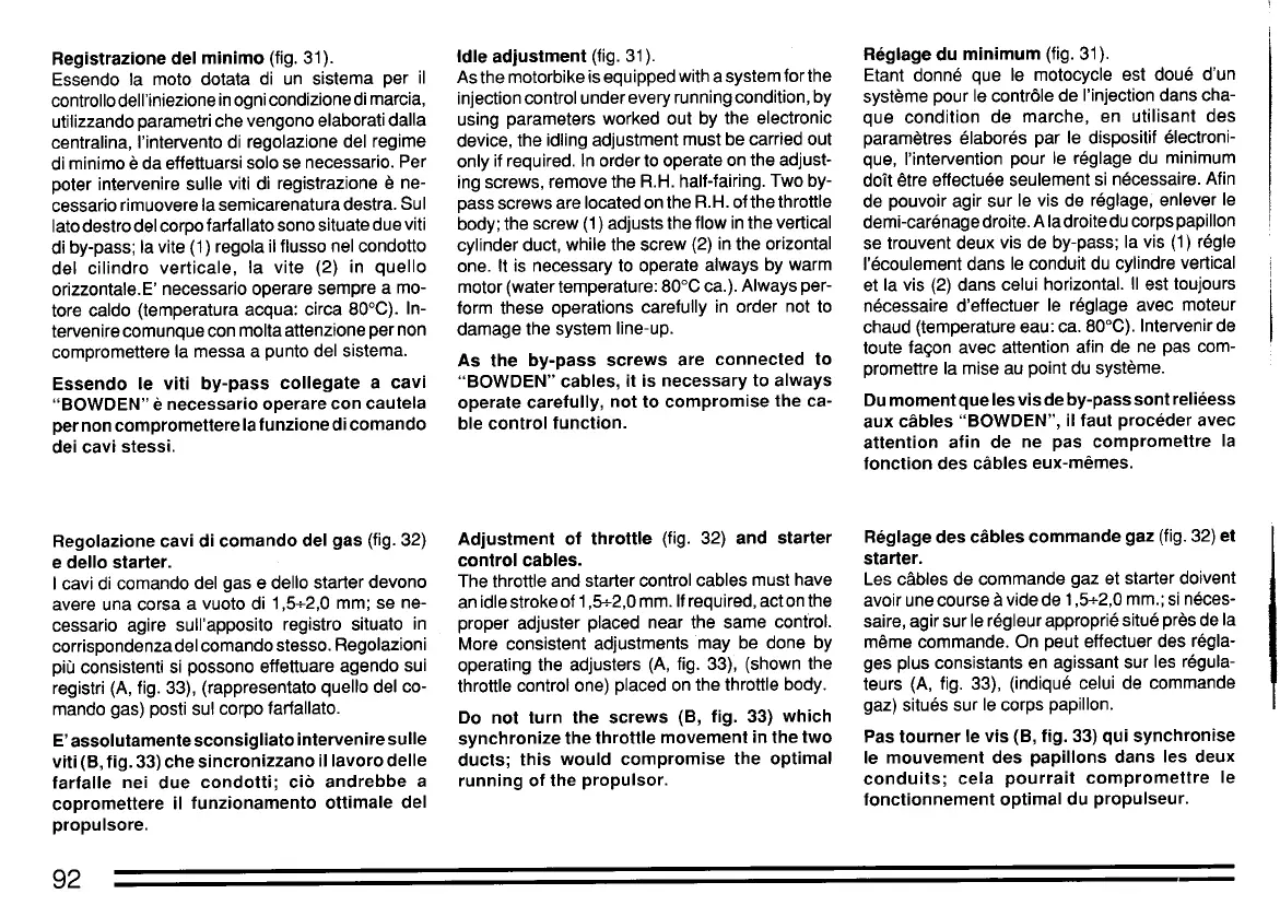 Regolazione cavi di comando del gas (fig. 32) Adjustment of throttle (fig. 32) and starter Réglage des cables commande gaz (fig. 32) et