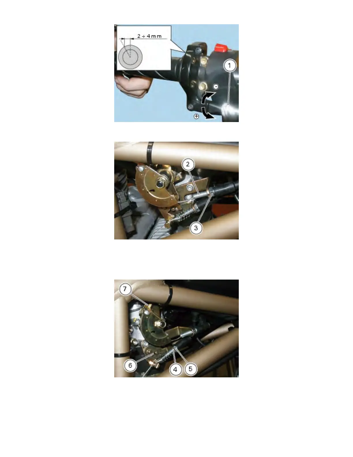 Likewise, loosen the lock nut (5) and work the adjuster (4) to adjust the throttle control cable.