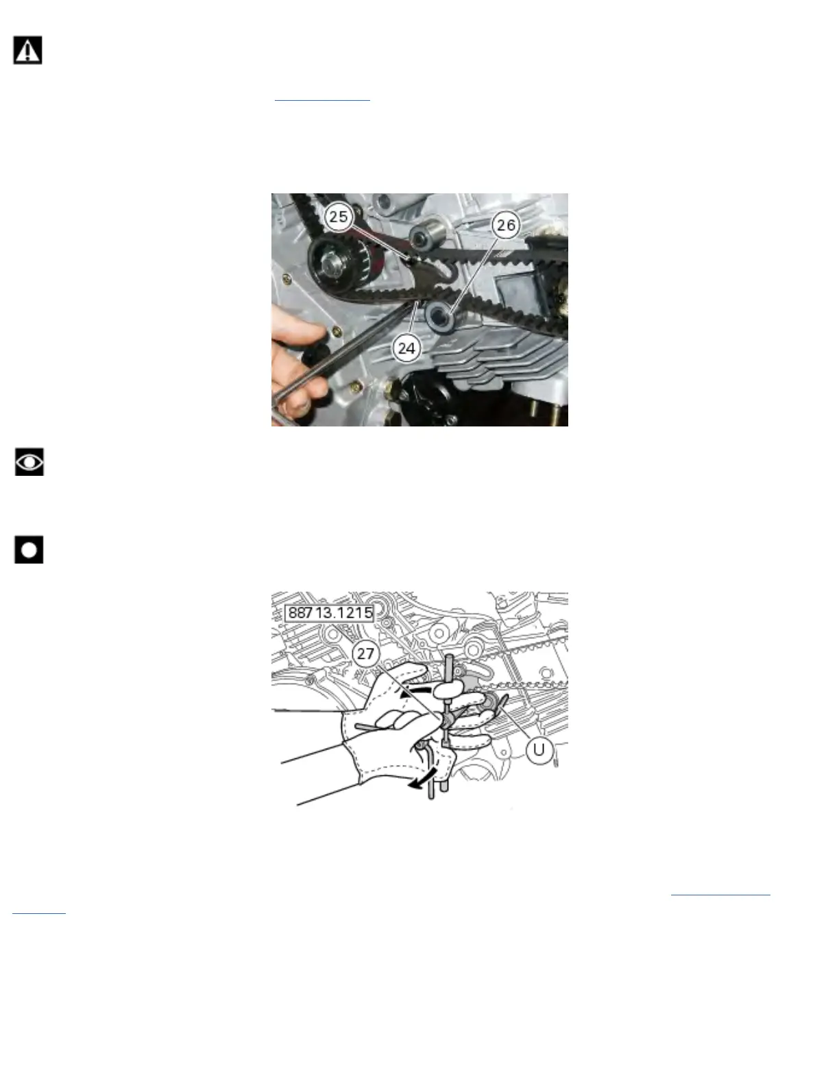 Lift the mobile tensioner (26) by hand to stretch the timing belt or lower down to slacken.