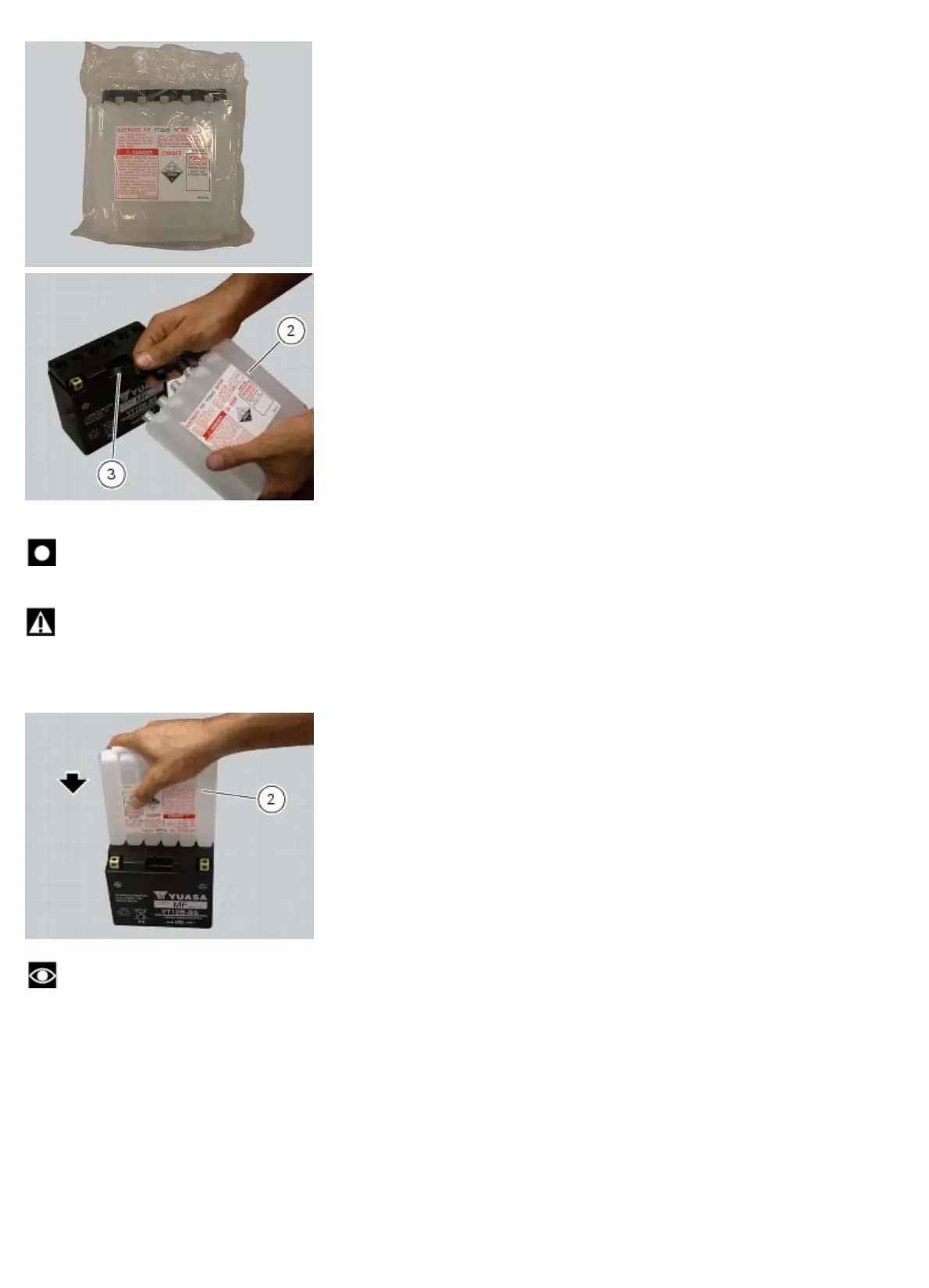 Place the electrolyte container (2) upside down. Align the six sealed elements with the six filler holes on the battery.