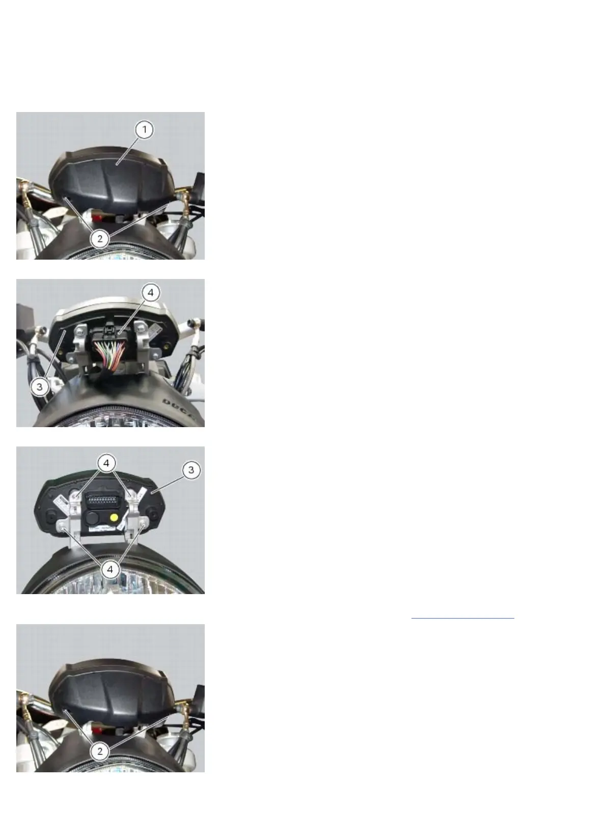 Undo the screws (4) and remove the instrument panel (3) from the front lights assembly support.