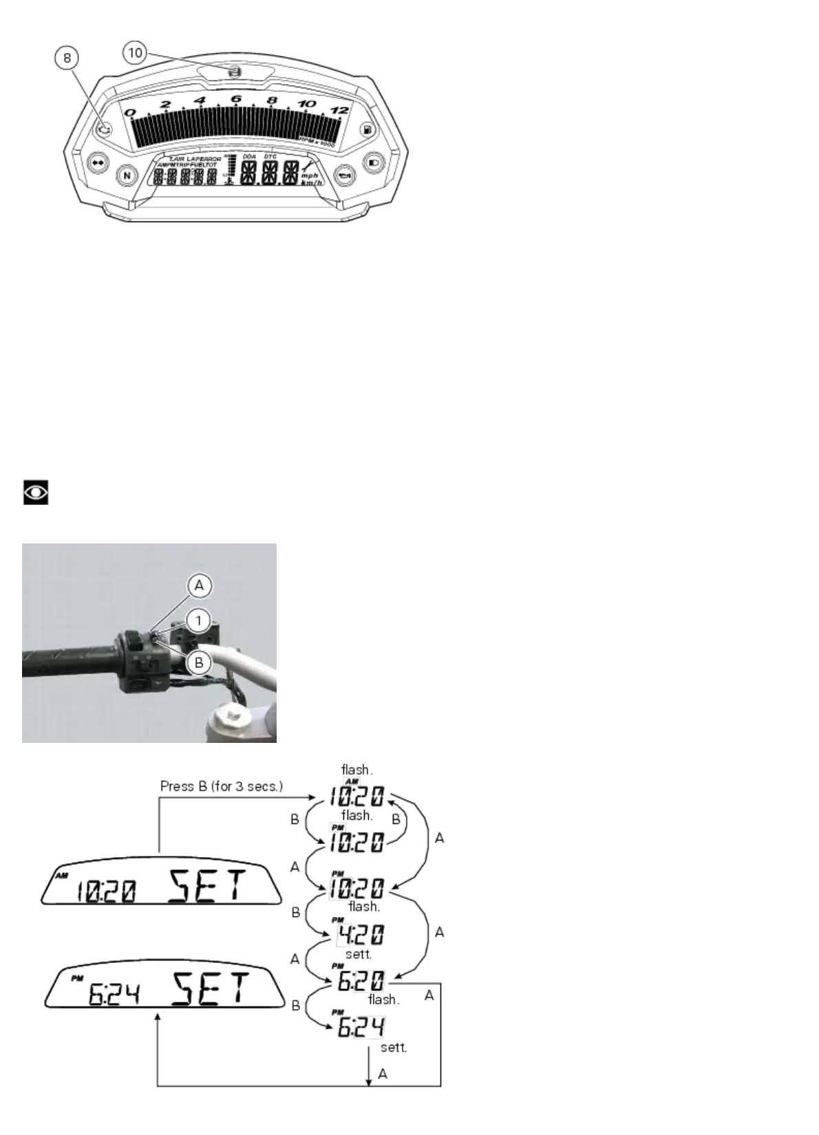you press switch (1) in position B “t” the mode will go back to previous setting (if it is 00:00, when toggling from “AM” to