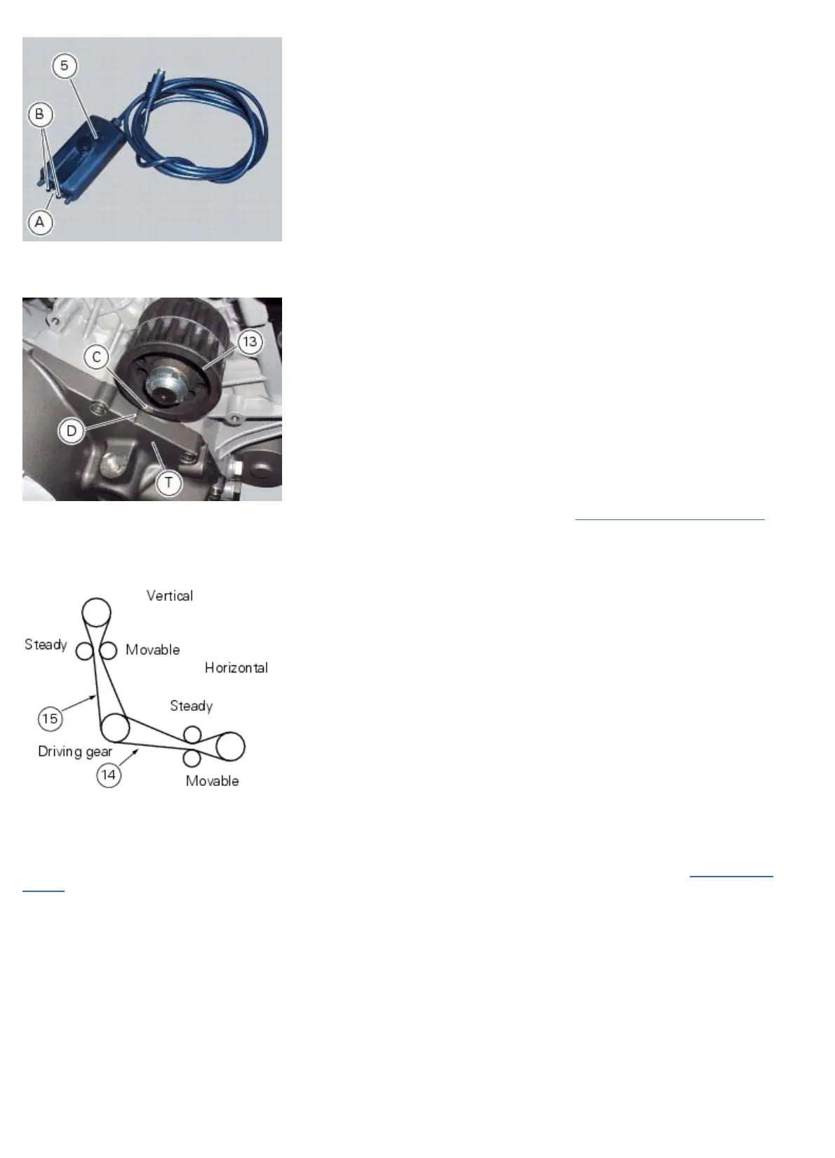 Measure the horizontal timing belt on the section (14) as described in the paragraph “Measuring timing belt tension”.