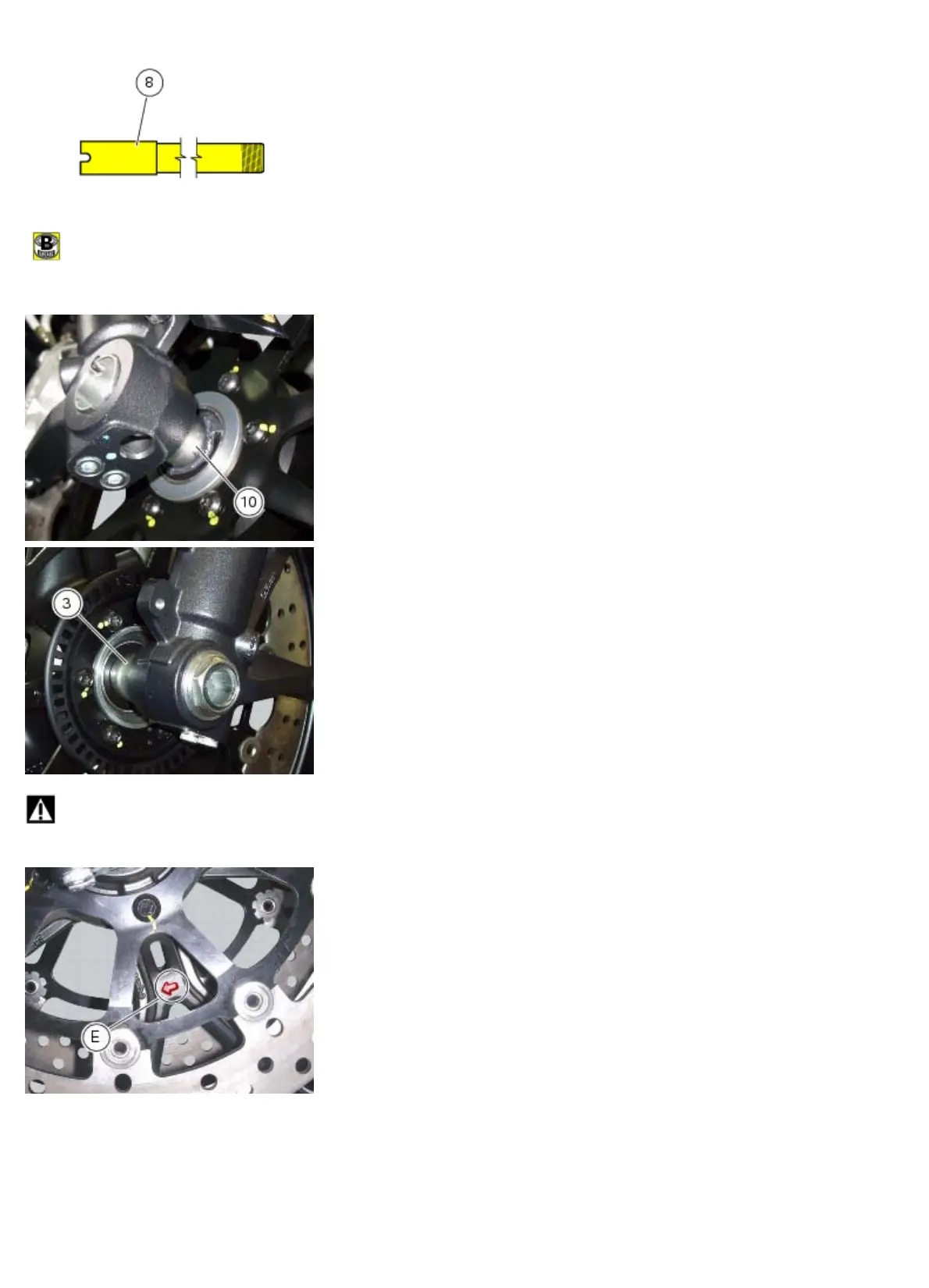 Fit the front wheel between the fork legs, installing spacer (10) in-between wheel hub and right-hand fork bottom end,