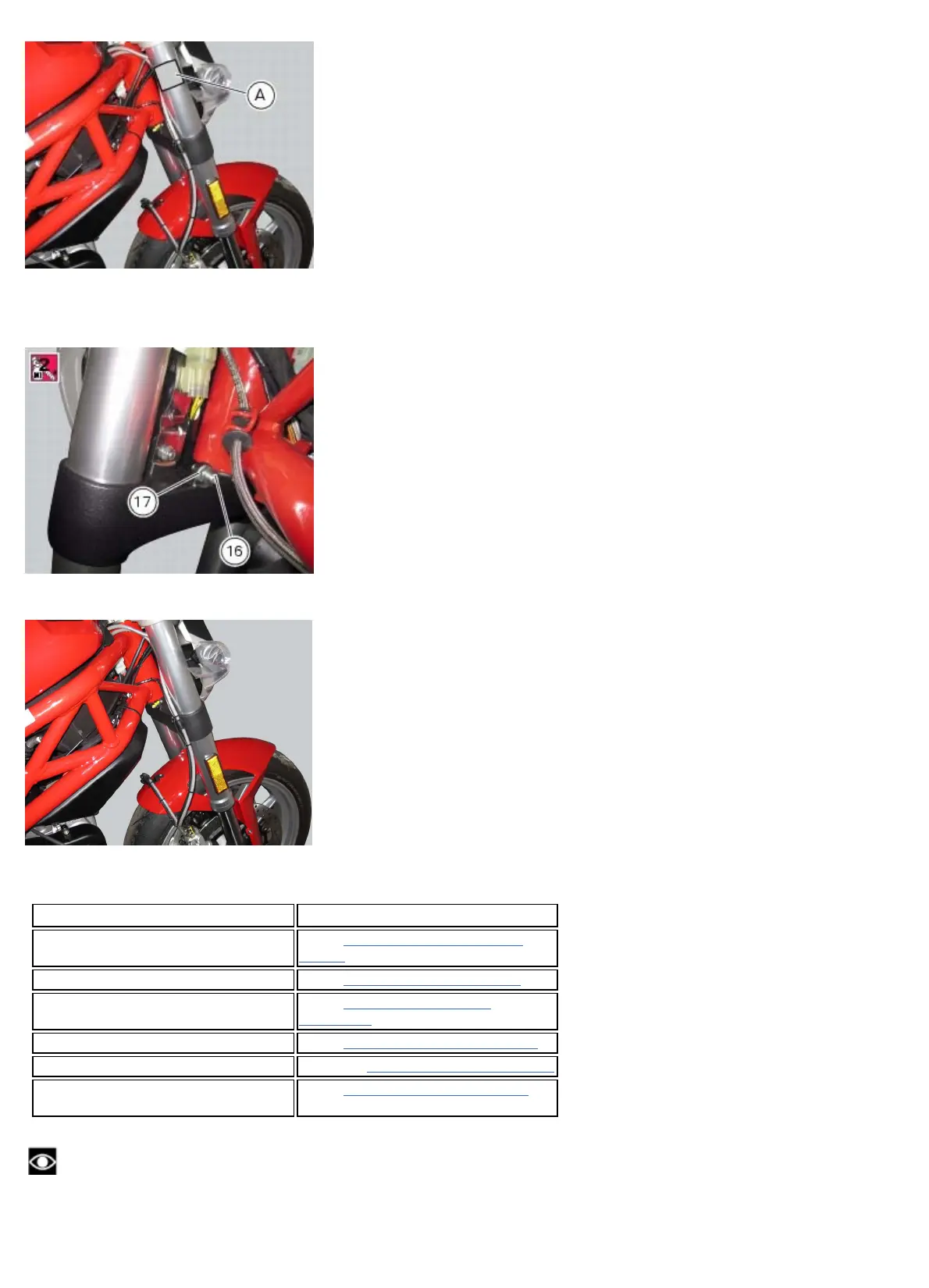 Apply threadlocker to the thread of nut (17). Hold the adjuster screw (16) firm and tighten the nut (17). Turn the forks to