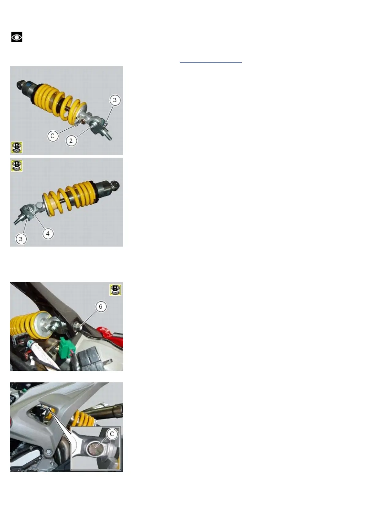 Orientate the rear shock absorber with the preload adjuster screw (C) as shown in the photo.