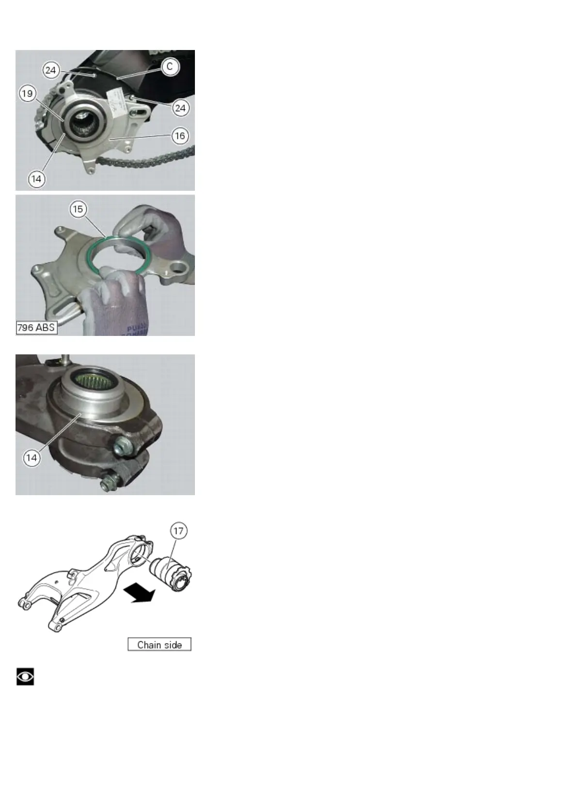 Withdraw the eccentric hub (17) from the chain side of the swingarm.