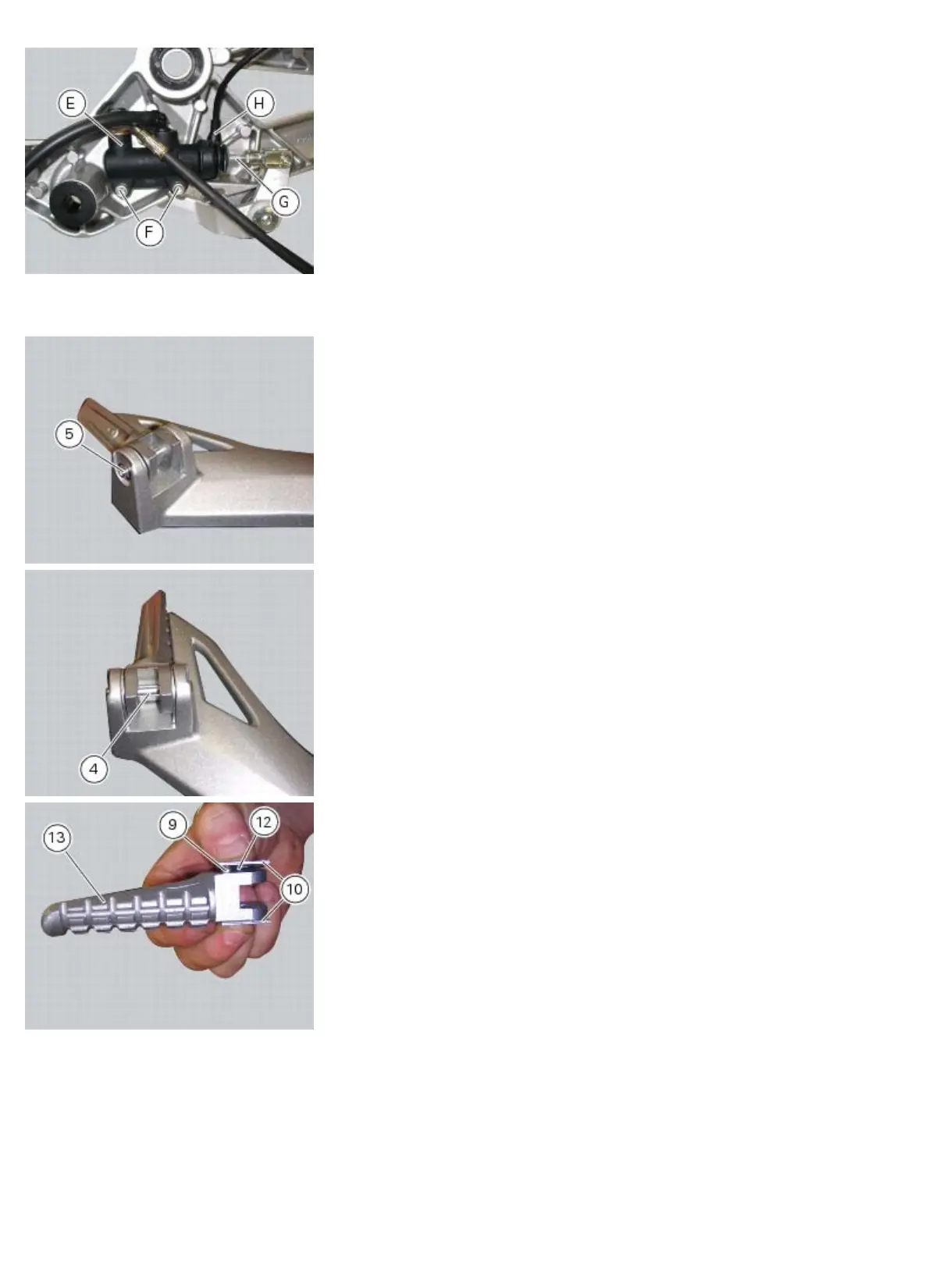 To separate the rear RH footrest (13) from the footrest bracket (8), remove the circlip (5) and drive out the pin (4) to