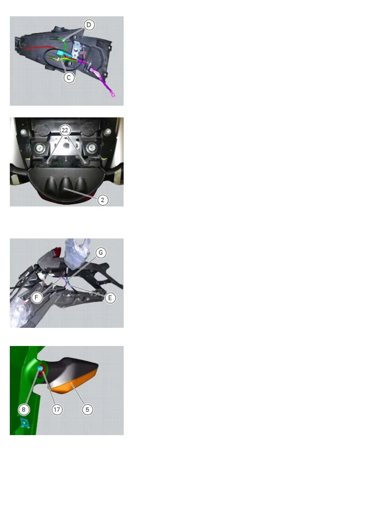 Remove clamp (G) fastening the rear right-hand turn indicator wiring (F) and rear left-hand turn indicator wiring (E).