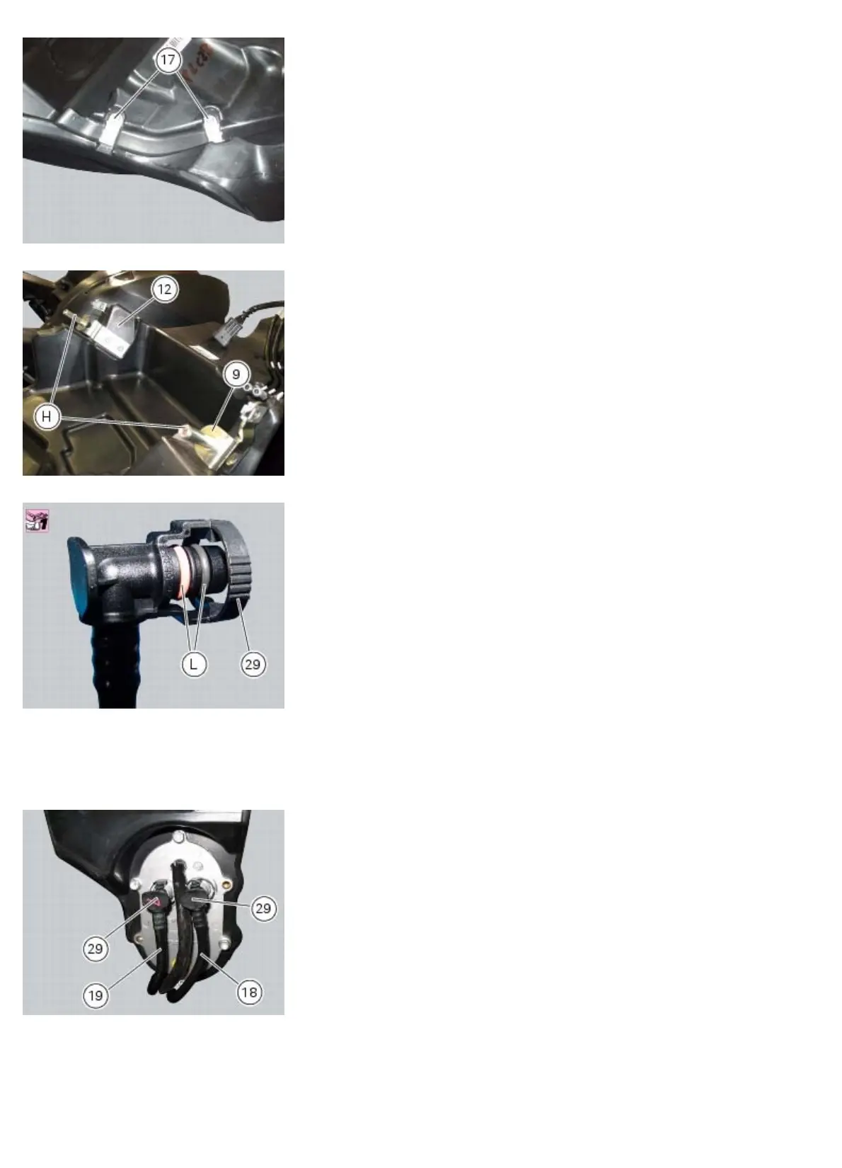Refit the tank by engaging pins (H) on mounting brackets (9) and (12) into their seats on the frame.