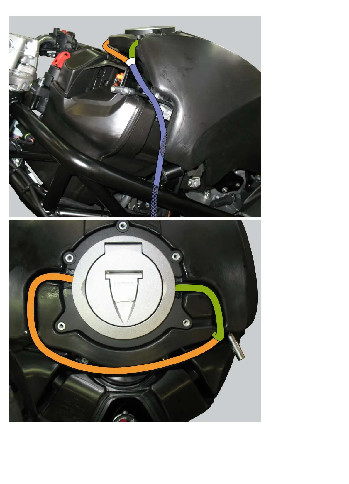 Positions of the fuel hoses connecting the fuel tank to the throttle body