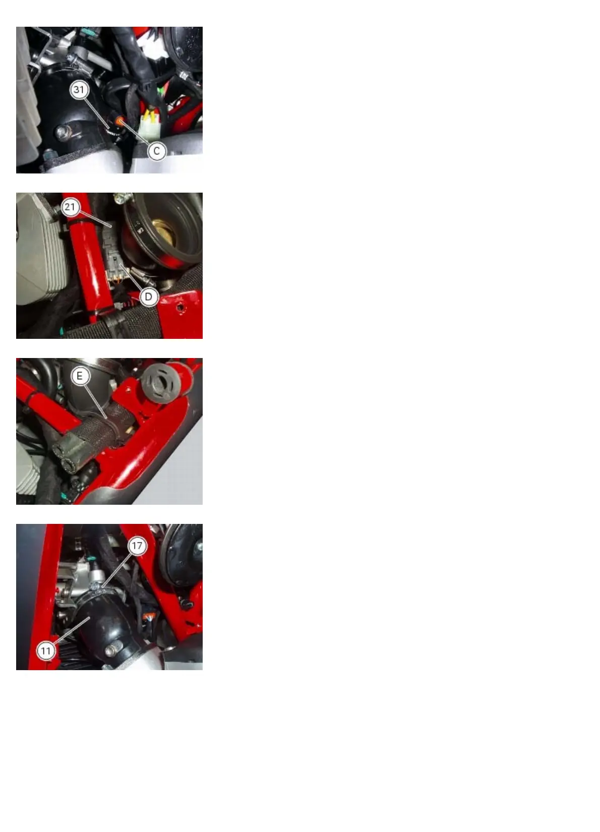 Disconnect the air pressure sensor (21) from the throttle body and detach connector (D) from the main wiring harness.