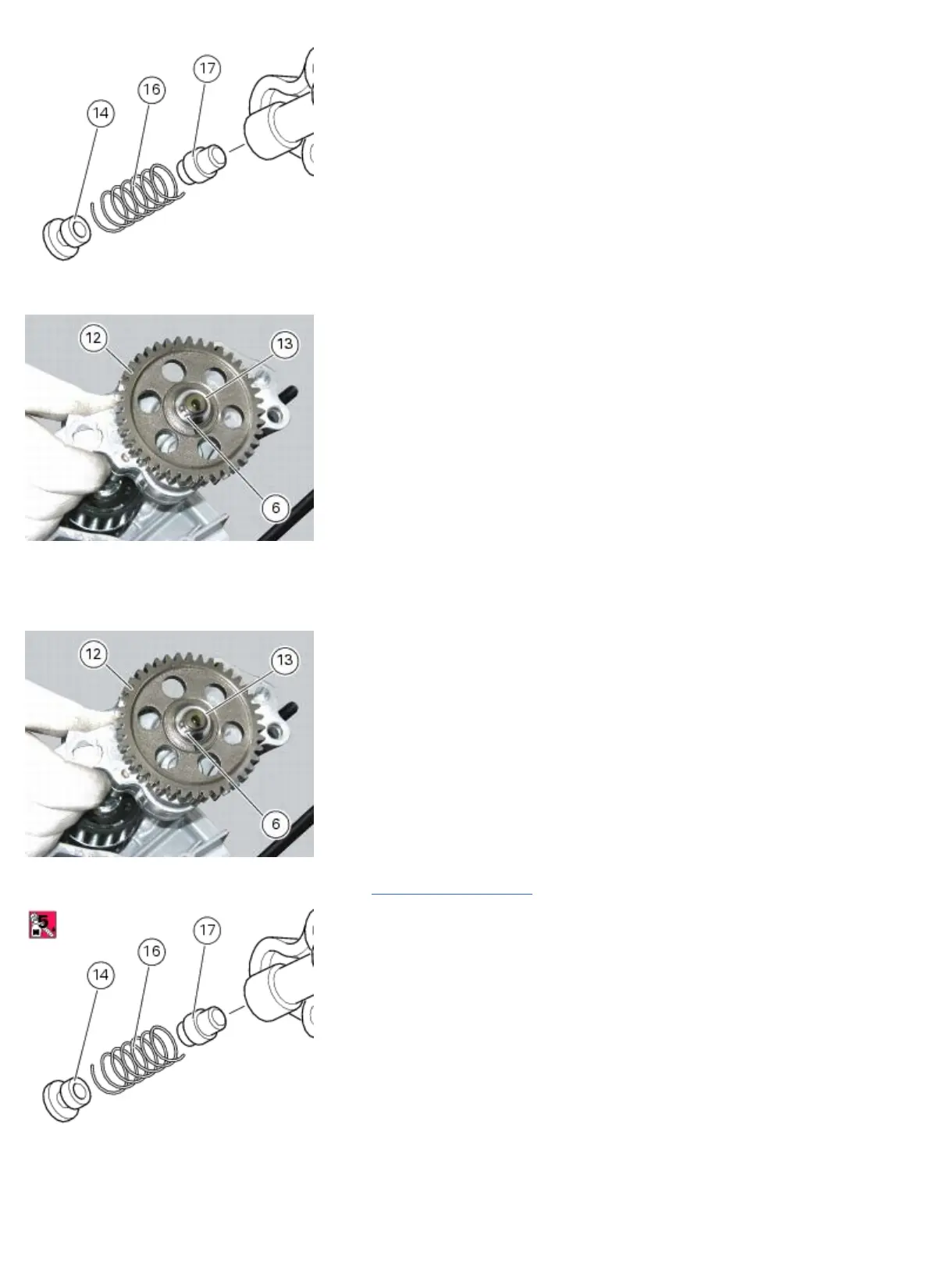 Fit on the oil pump the pump drive gear (12), the circlip (3) and the bush (13).