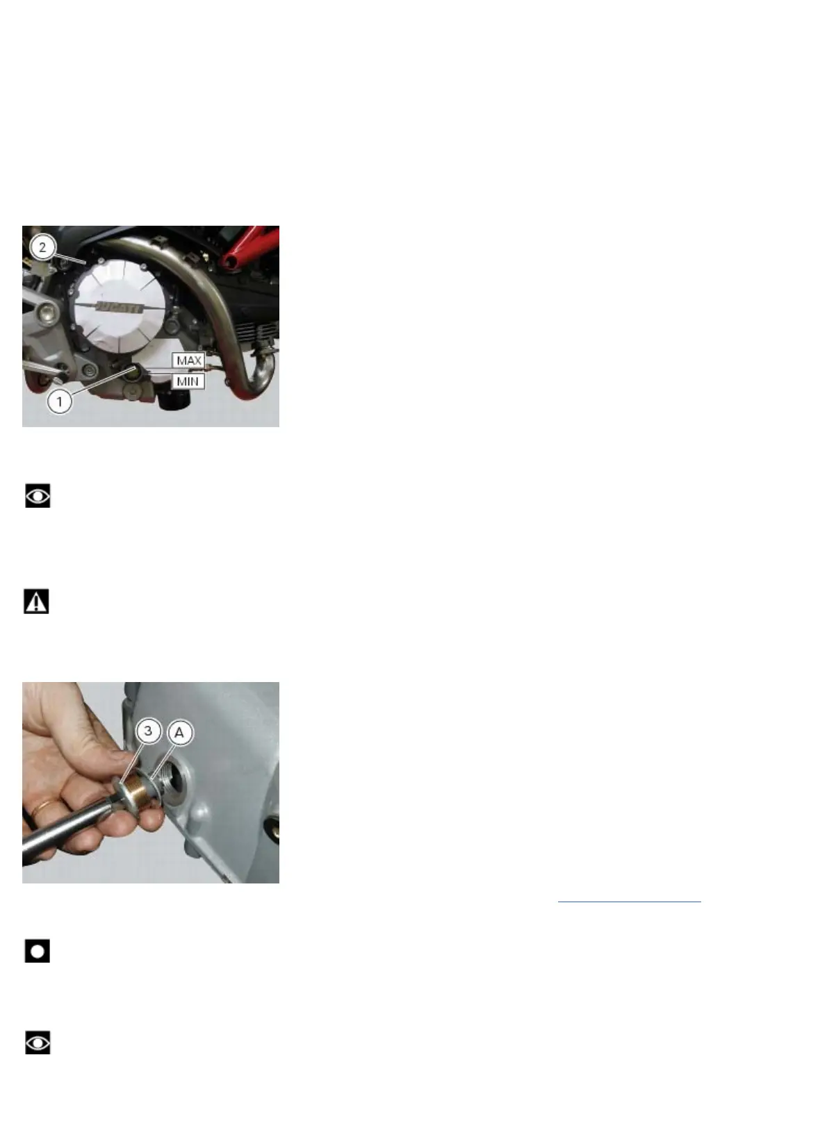 The oil must be between the MIN and MAX marks. If the level is low, top it up. Remove the filler cap (2) and top up with