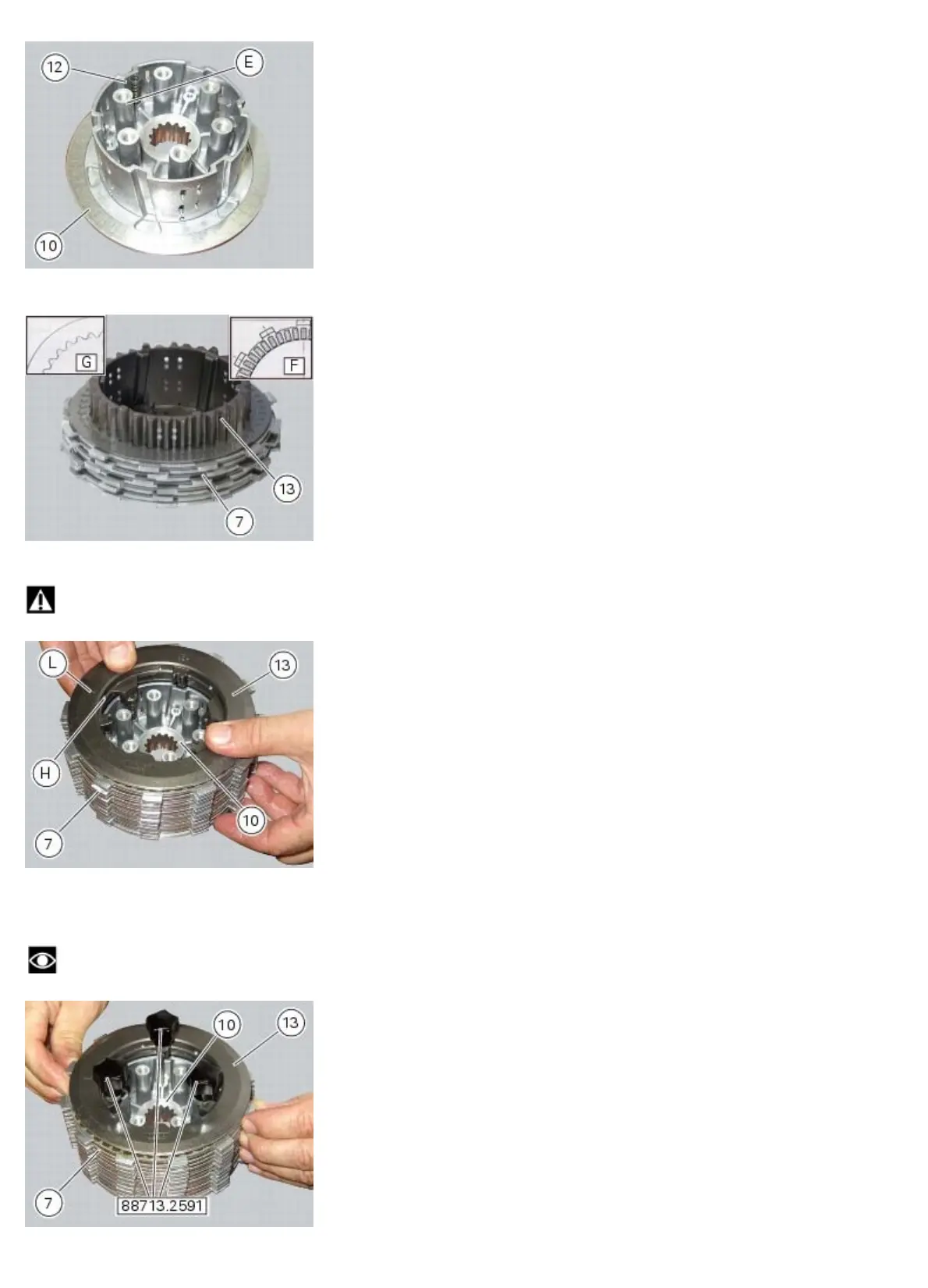 Install the clutch plates (7) in the hub (13) starting with one of the 11 friction plates (F) and alternate with the 10 driven