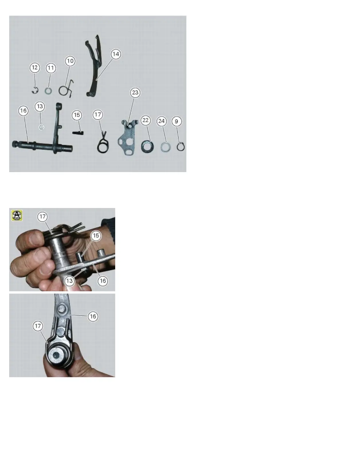 If the components of the gearchange mechanism were dismantled on removal, fit the spring (17) on the shaft (16) in the