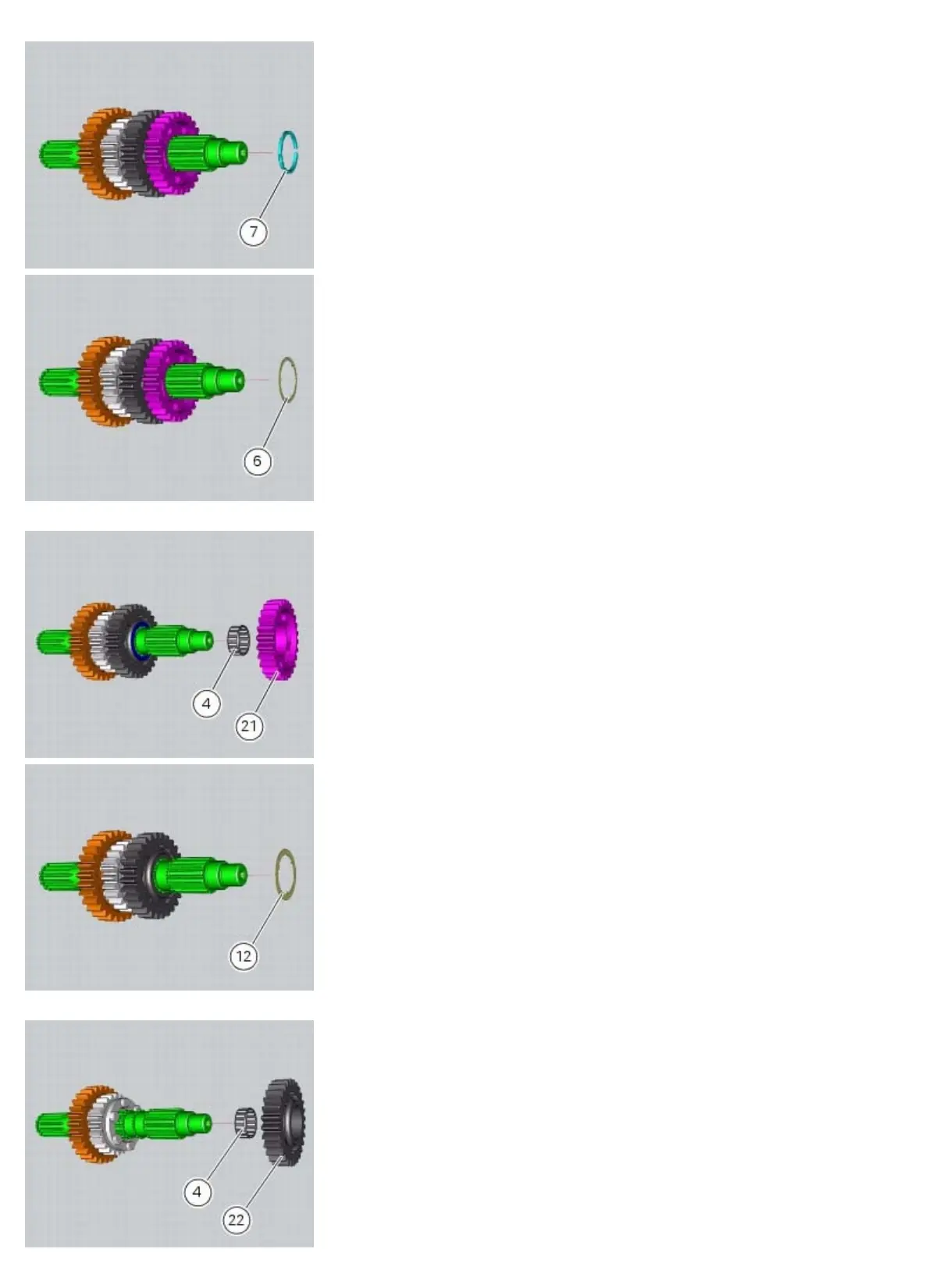 Withdraw the fourth speed driven gear (21) with the roller cage (4) and splined washer (12).