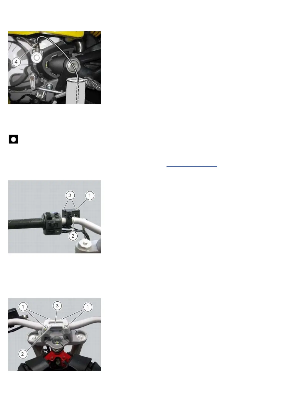Unscrew the four screws (1), remove the clamp (2) and remove the handlebar (3) from the steering head, positioning it