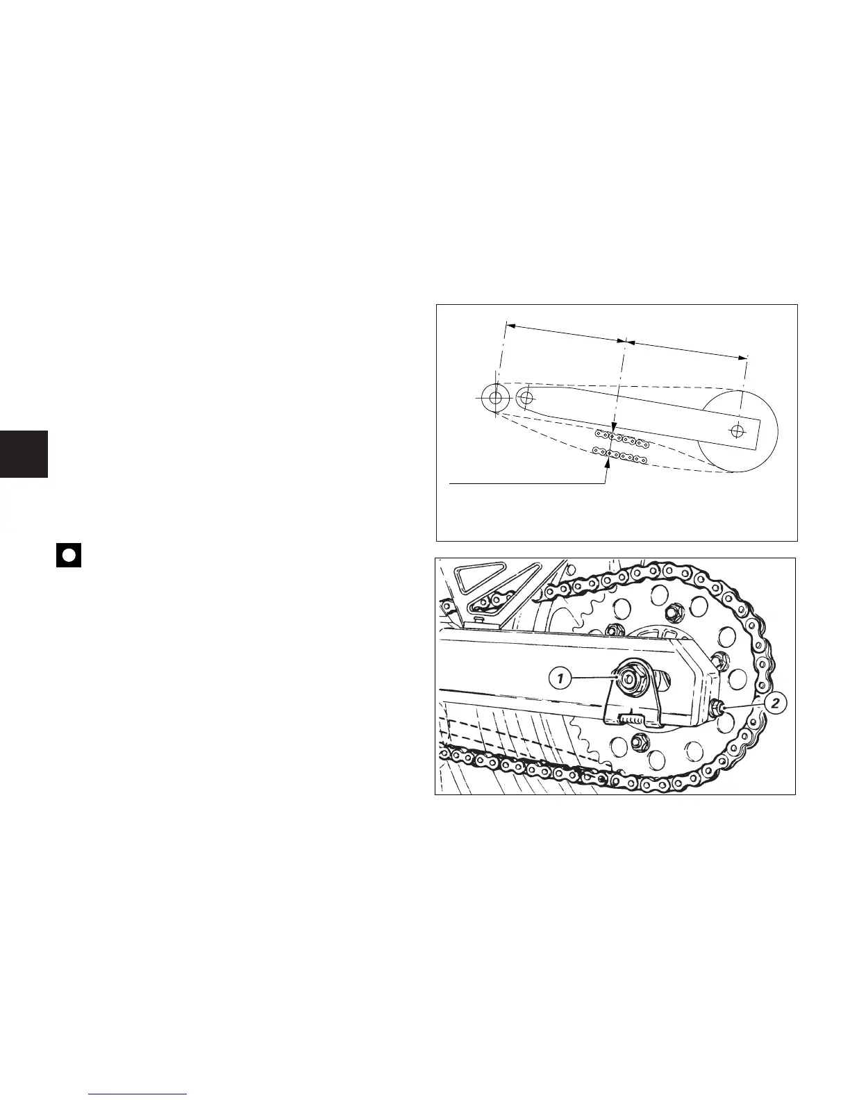 To adjust chain tension, slacken the nut (1, fig. 33.2) of