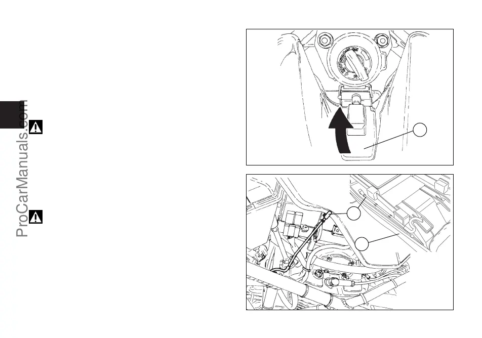 Remove the seat (page 28) and lift the hook (1).