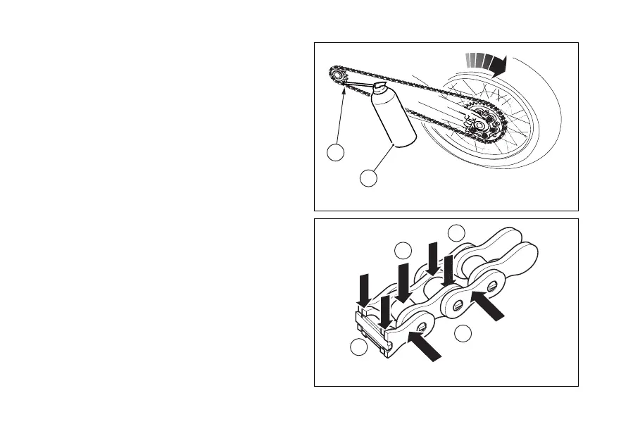 Apply the lubricant jet (1) inside the chain between