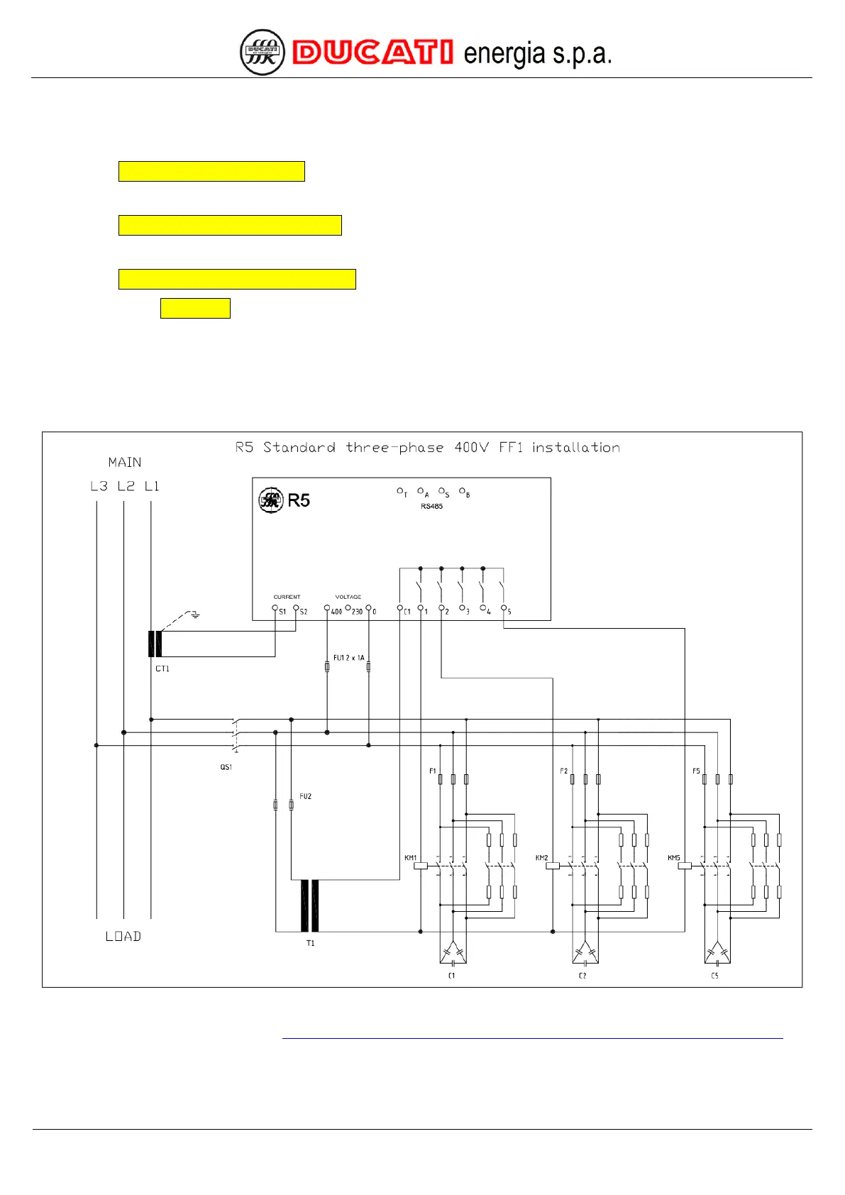 Connect all the available power factor correction banks using terminals from 1 to 5, as indicated for banks 1, 2 and 5.