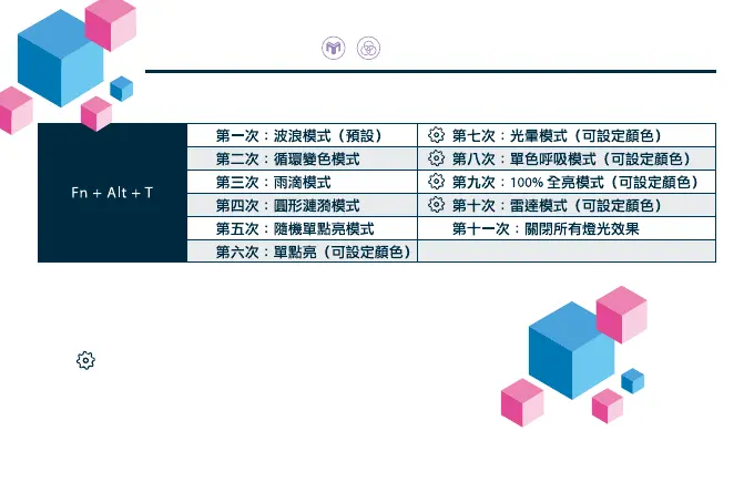 ● Fn + Alt + T 按住3秒鐘,可以關閉所有燈光效果(含CM1、CM2)。